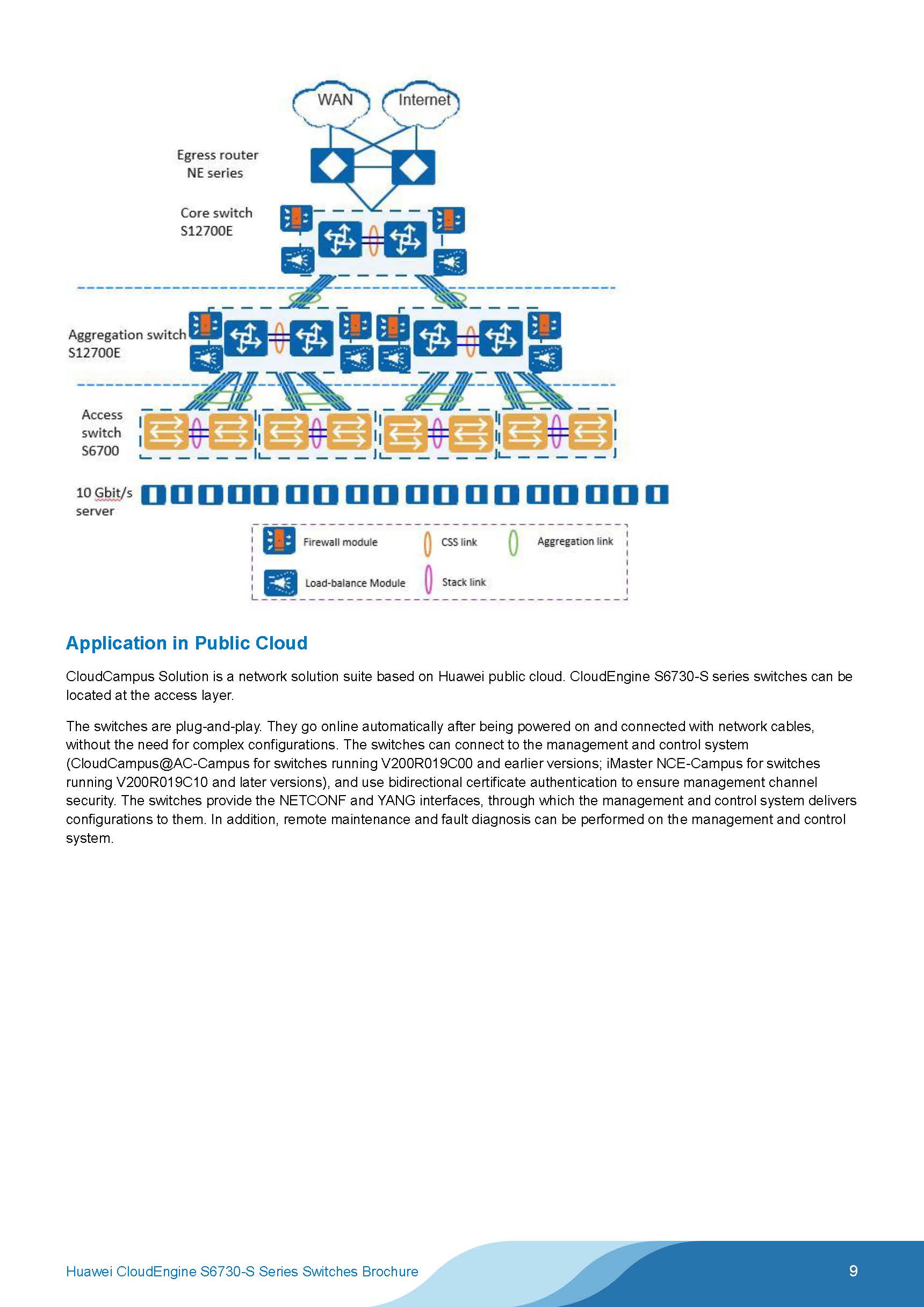 Providing 10 GE downlink ports alongside 40 GE uplink ports, Huawei CloudEngine S6730-S series switches deliver high-speed, 10 Gbit/s access to high-density servers. CloudEngine S6730-S also functions as a core or aggregation switch on campus networks, providing a rate of 40 Gbit/s.