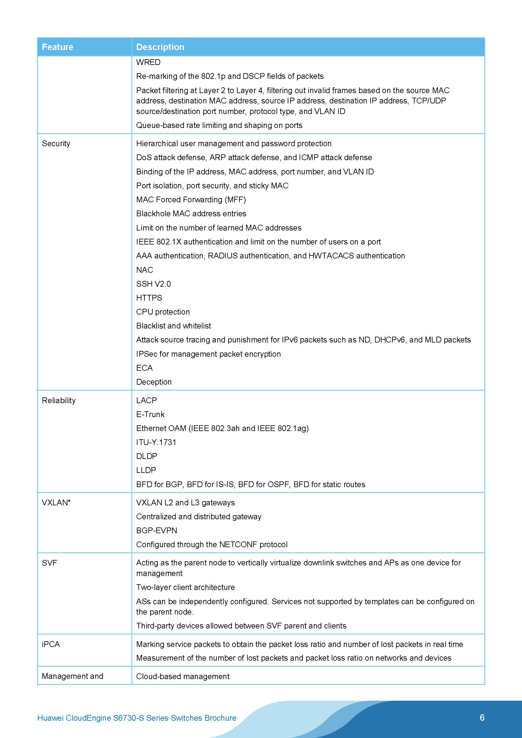 With Virtual Extensible Local Area Network (VXLAN)-based virtualization, comprehensive security policies, and a range of Quality of Service (QoS) features, CloudEngine S6730-S helps enterprises build scalable, reliable, and secure campus and data center networks.