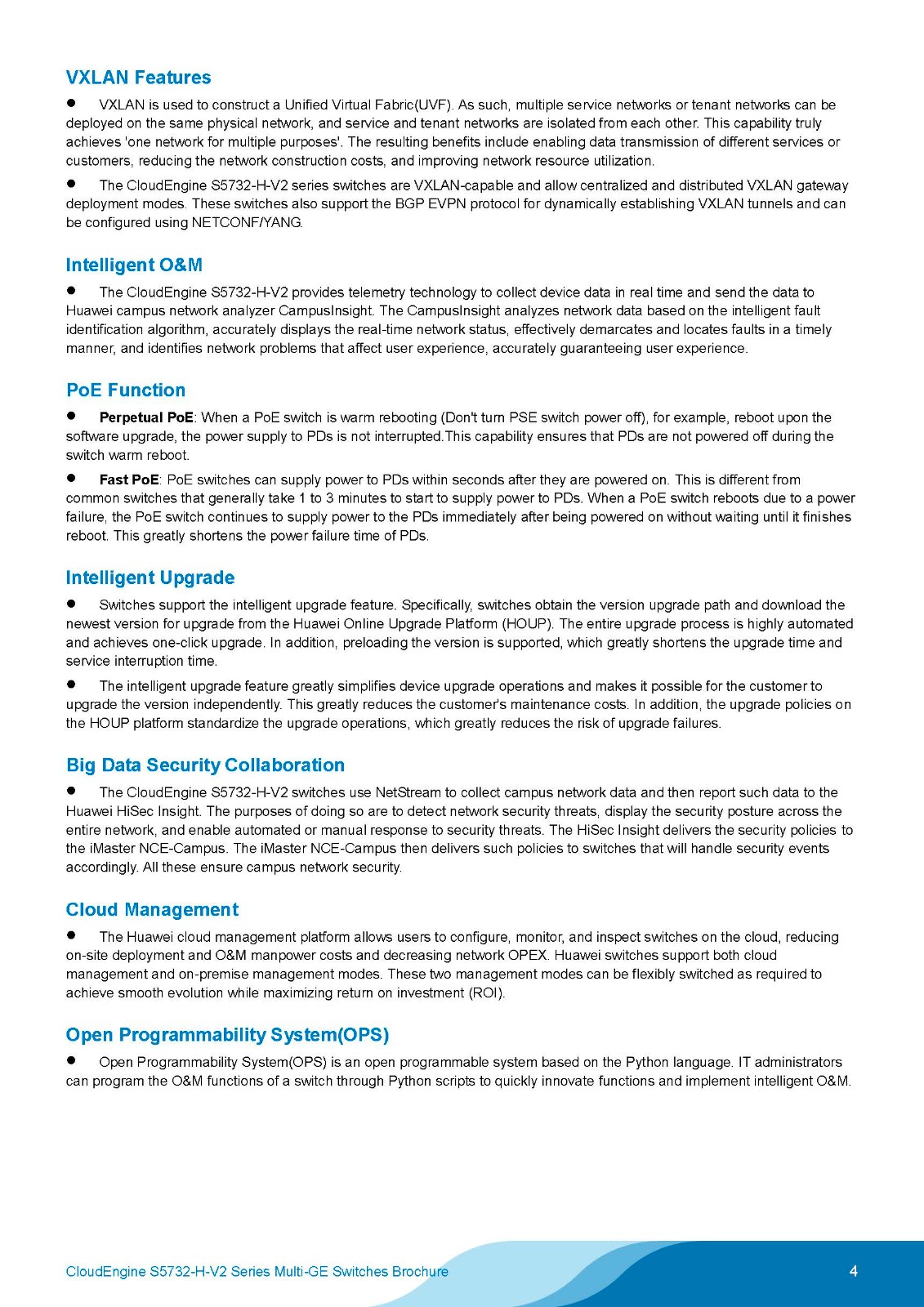 CloudEngine S5732-H-V2 series switches are next-generation Multi-GE access switches that provide 24-port, 48-port models, and provide four 25GE and two 100GE uplink ports.