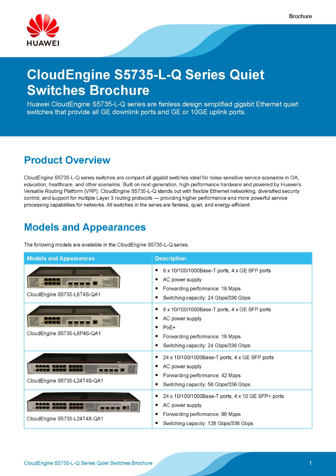 CloudEngine S5735-L-Q Series Quiet Switches are compact all-gigabit switches designed for noise-sensitive service scenarios in a wide range of sectors, from Office Automation (OA) and education to healthcare.
