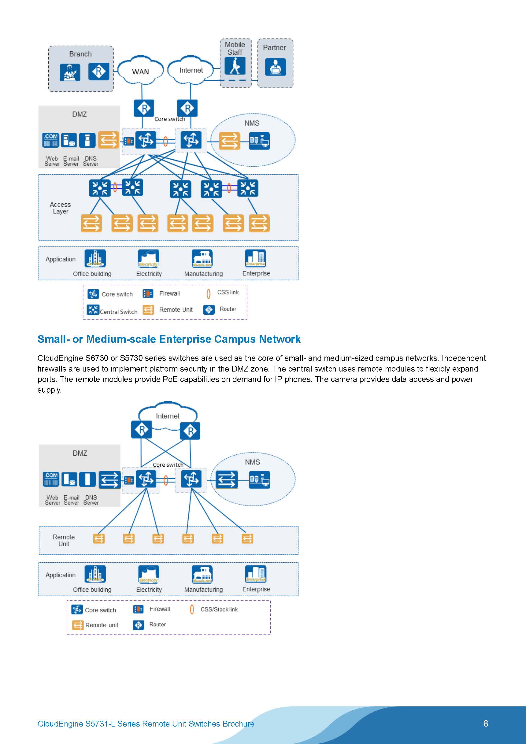 Based on simplified architecture, these remote unit switches provide all-gigabit data access to implement simplified network deployment. Supporting optical-electrical Power over Ethernet (PoE), they draw more than 1000 m PoE from central switches and can be used in a wide range of scenarios, including offices, education institutions, hotels, and healthcare facilities, helping enterprises to construct low-carbon buildings.