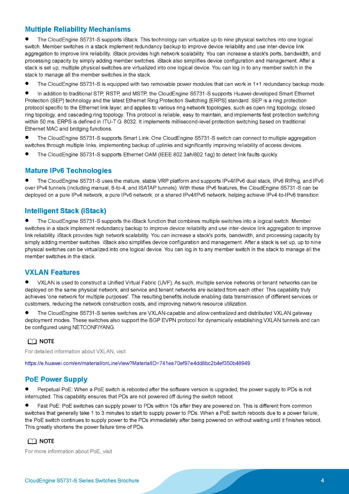 Built on Huawei's unified Versatile Routing Platform (VRP), CloudEngine S5731-S switches provide enhanced Layer 3 features, simplified Operations & Maintenance (O&M), Intelligent Stack (iStack) technology — allowing multiple stacking-capable switches to function as a single logical switch — flexible Ethernet networking, and mature Internet Protocol version 6 (IPv6) features.