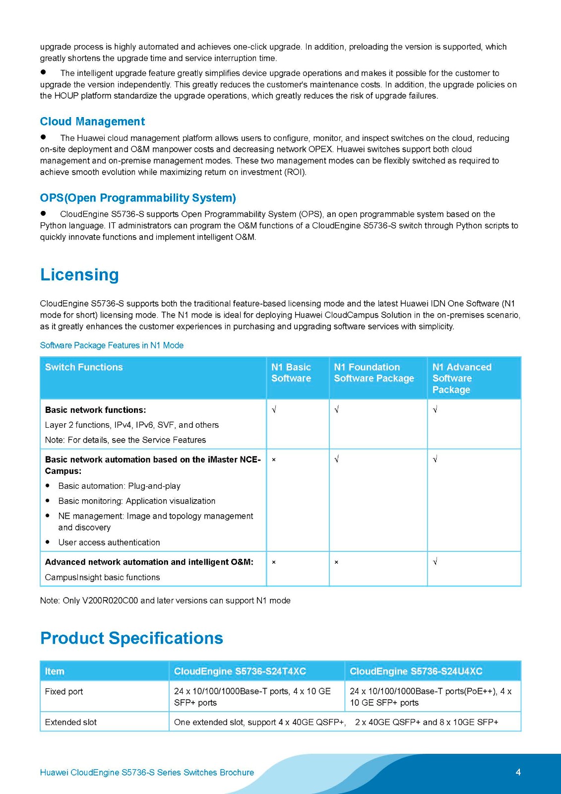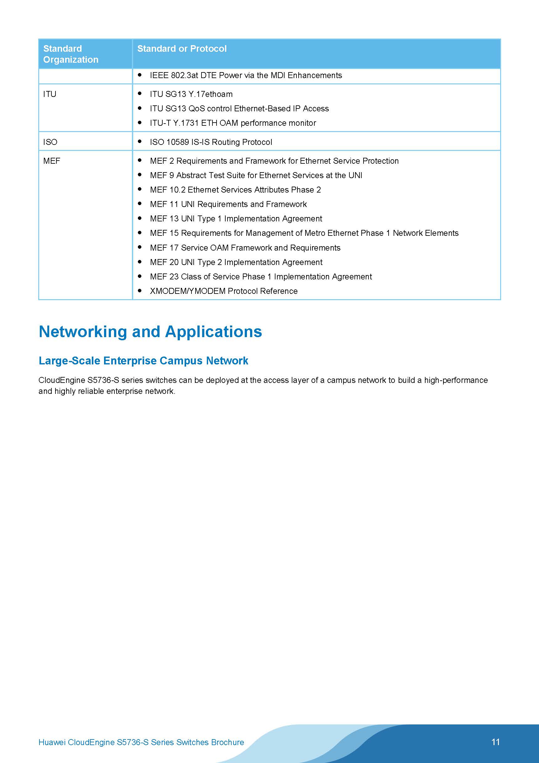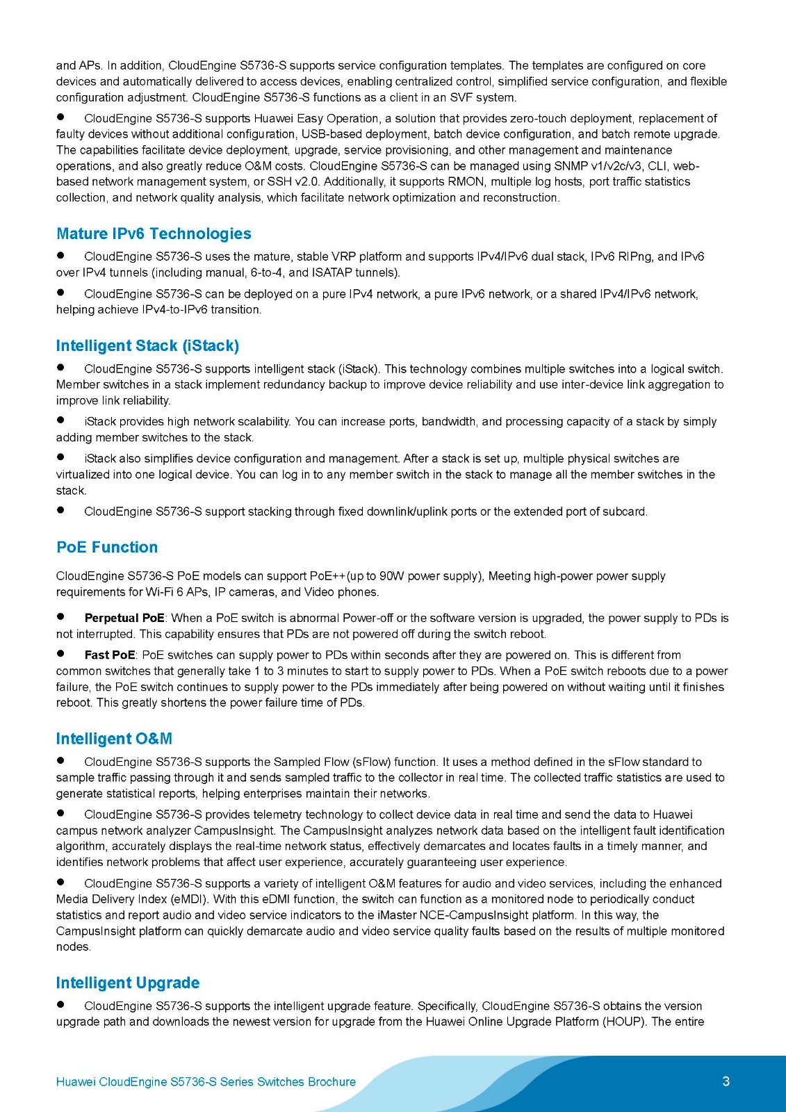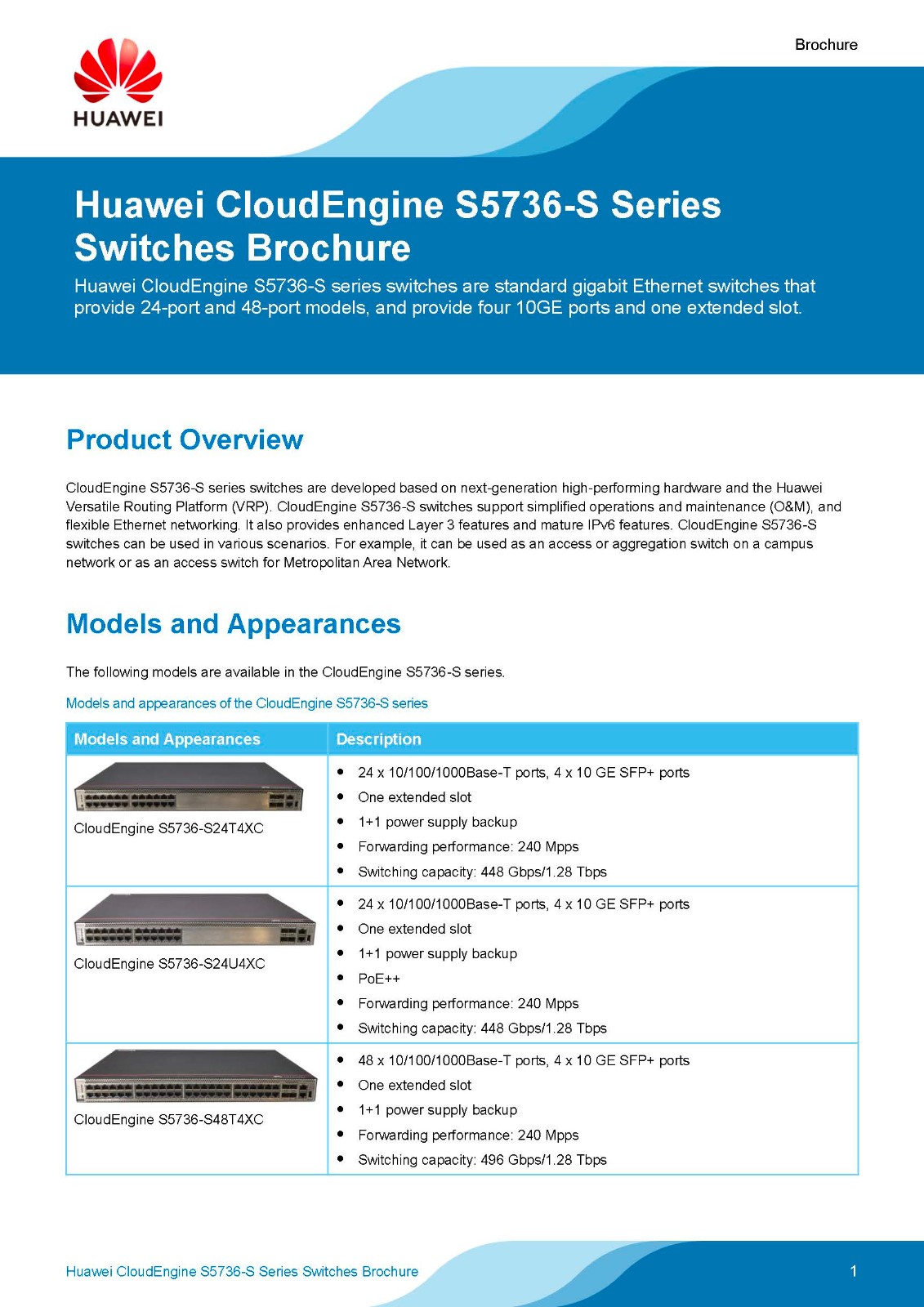 CloudEngine S5736-S series switches are next-generation standard all-gigabit switches, featuring 24 or 48 PoE/non-PoE GE downlink ports, four 10GE uplink ports, and one extended card slot. Built on the next-generation high-performance hardware and Huawei's Versatile Routing Platform (VRP), CloudEngine S5736-S series stands out with enhanced Layer 3 features, easy Operations and Maintenance (O&M), flexible Ethernet networking, and mature IPv6 features. With these merits, this series is best suited for healthcare, retail, mining, ISP, and other industries.