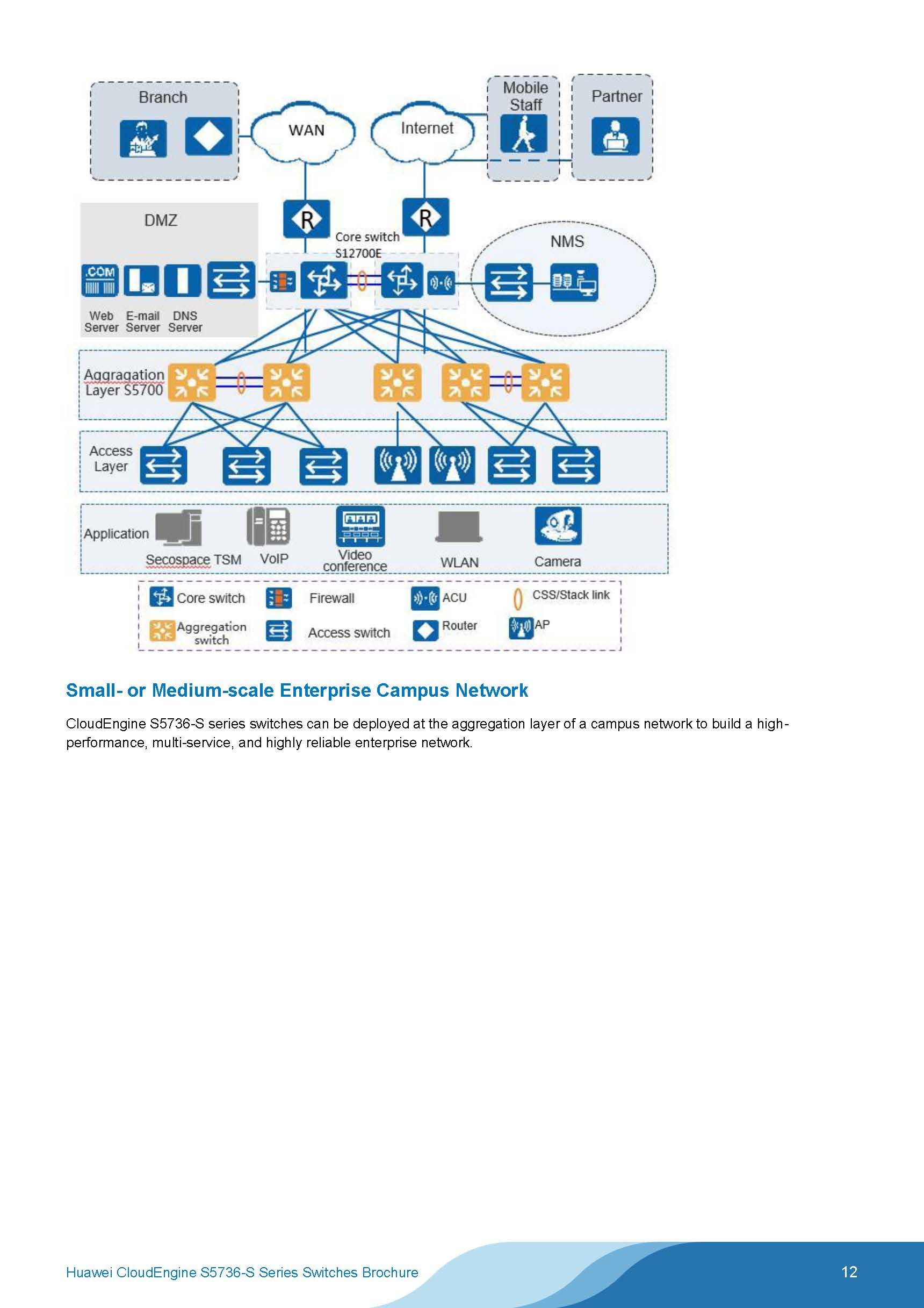 Based on Huawei's Versatile Routing Platform (VRP), CloudEngine S5736-S supports enhanced Layer 3 features, simplified Operations and Maintenance (O&M), flexible Ethernet networking, and mature Internet Protocol version 6 (IPv6) features. The series can be used as access or aggregation switches on campus networks or as access switches on Metropolitan Area Networks (MANs) or data center networks.
