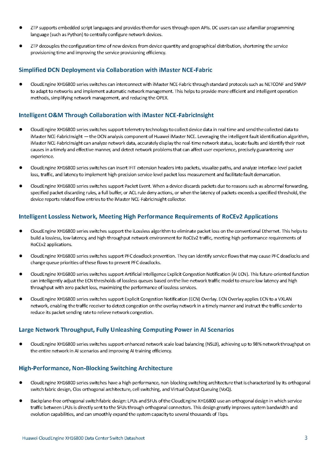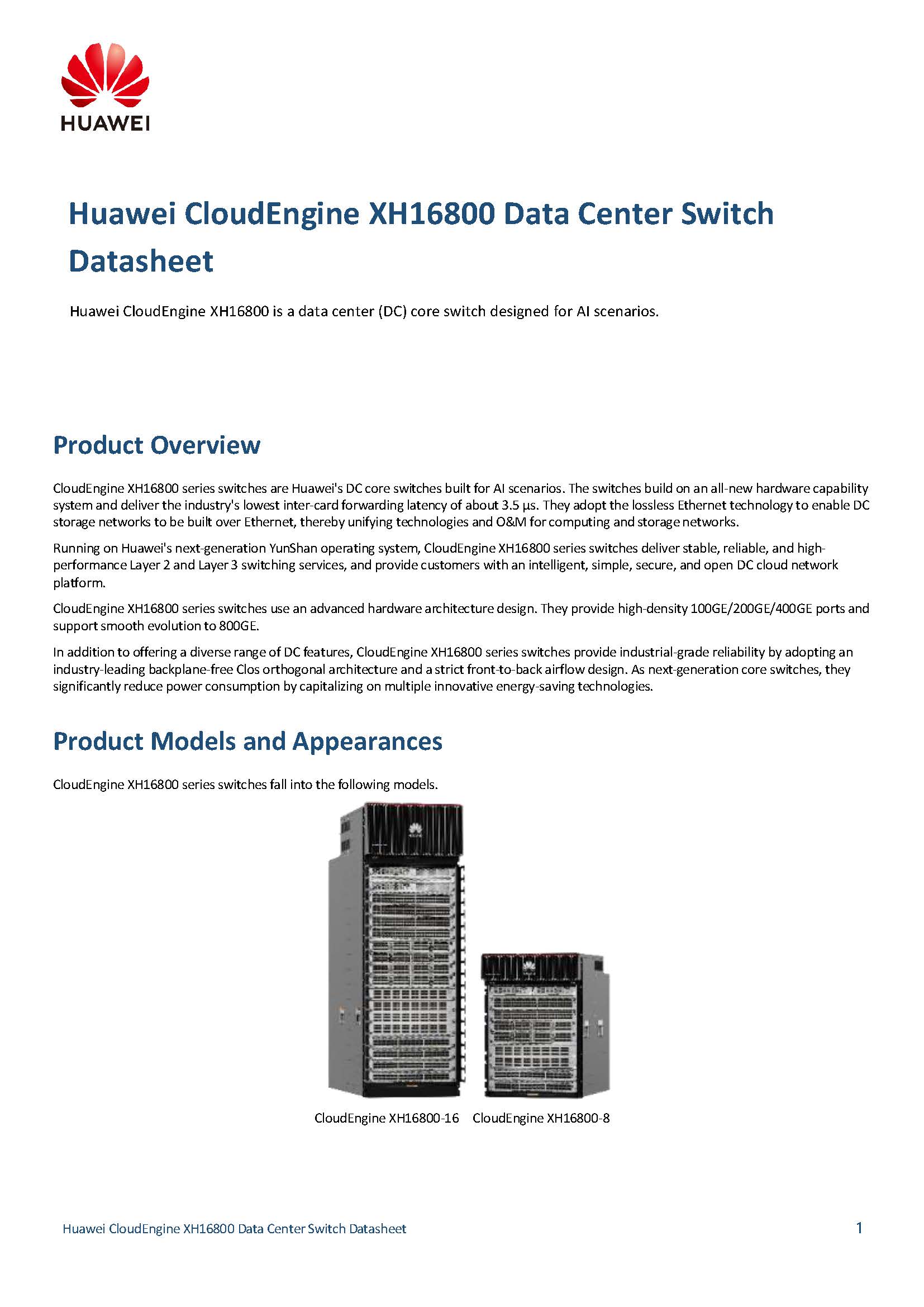 CloudEngine XH16800 series switches are Huawei's DC core switches built for AI scenarios. It has two major characteristics: high computing power efficiency and high computing power availability. In terms of computing power efficiency, CloudEngine XH16800 series switches support NSLB (network-level load balancing), achieving 10% increase in average bandwidth. In terms of computing power availability, it supports functions such as AI ZTP to increase O&M efficiency.