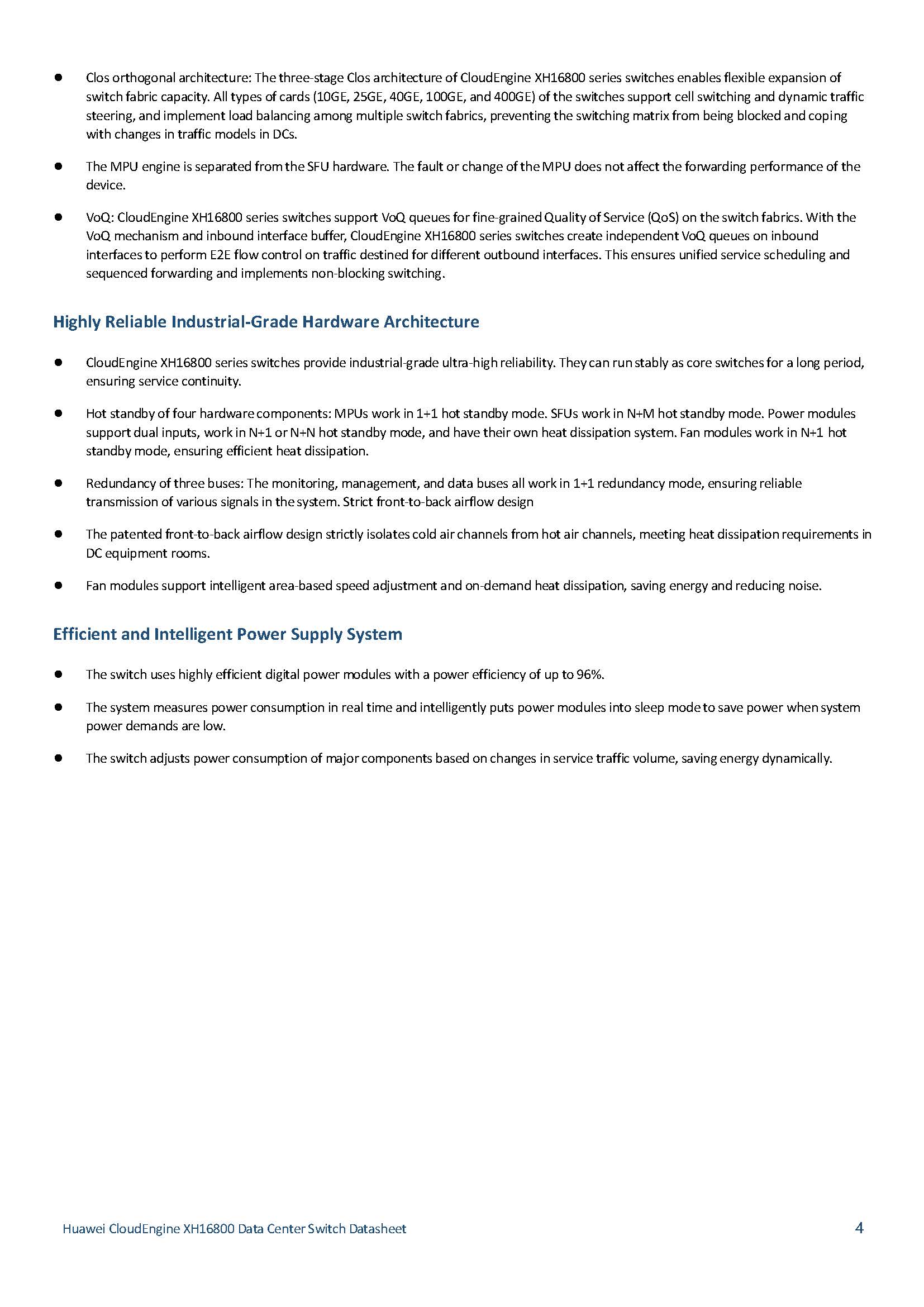 In addition to offering a diverse range of DC features, CloudEngine XH16800 series switches provide industrial-grade reliability by adopting an industry-leading backplane-free Clos orthogonal architecture and a strict front-to-back airflow design. As next-generation core switches, they significantly reduce power consumption by capitalizing on multiple innovative energy-saving technologies.