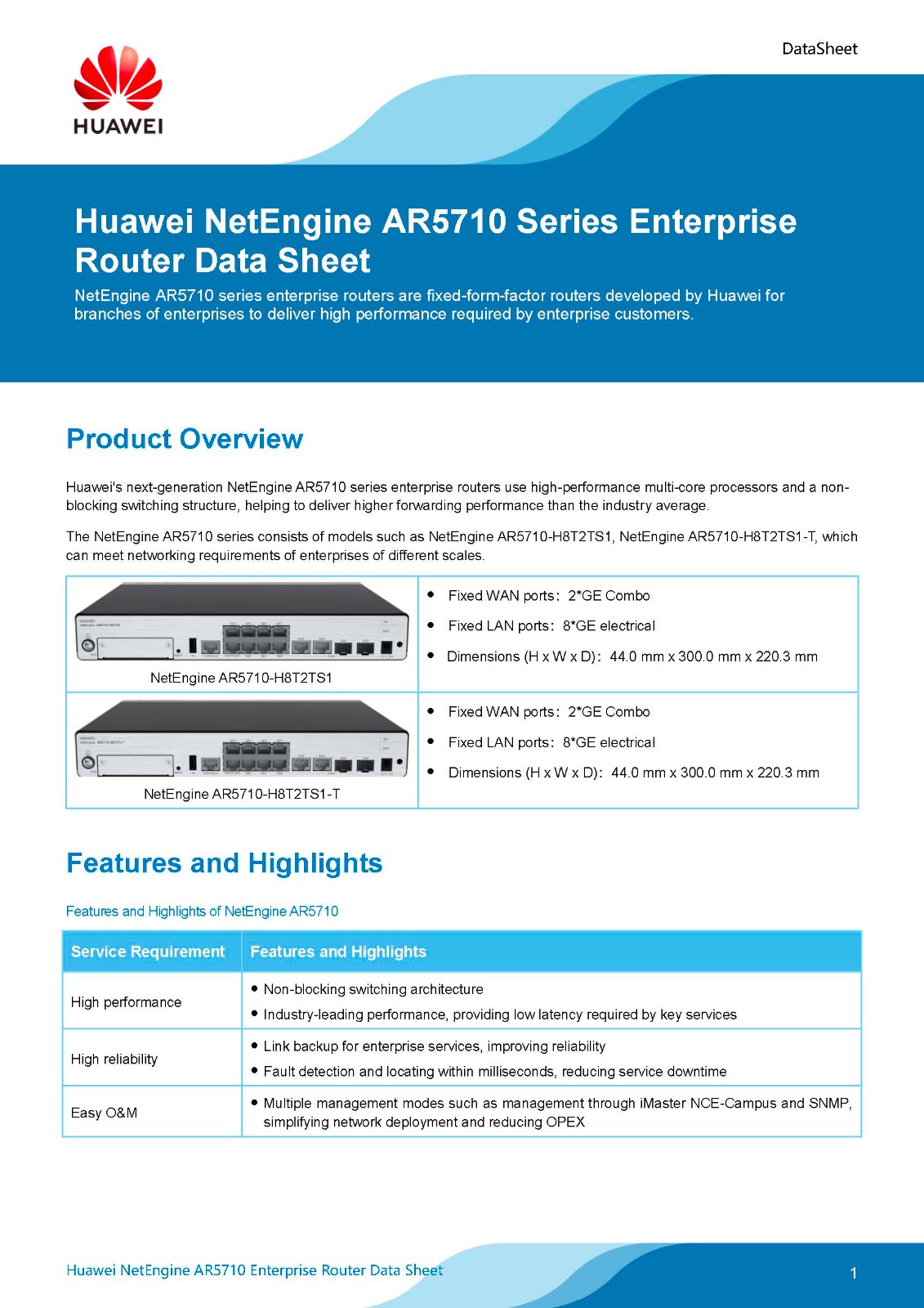 Huawei NetEngine AR5700 series enterprise routers can be deployed at the headquarters or branches of small- and medium-sized enterprises on demand to provide enterprise network egress capabilities. This series includes the NetEngine AR5710-H8T2TS1 and NetEngine AR5710-H8T2TS1-T , which adapts to the service networking requirements of enterprises of different scales.