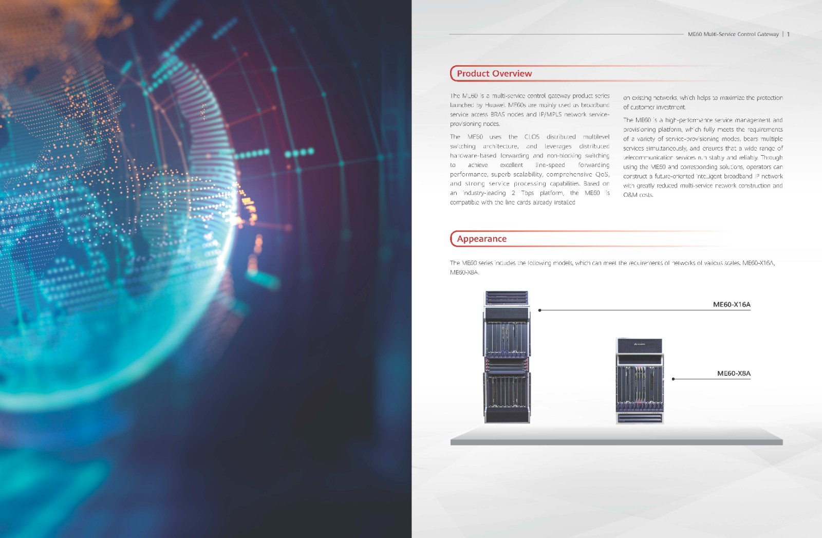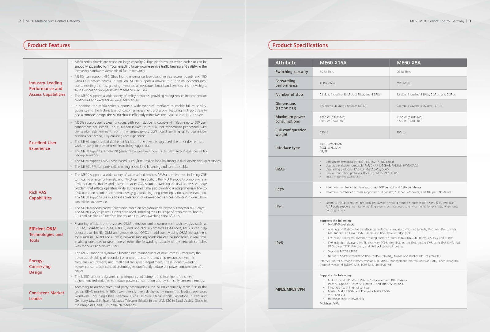 The ME60 series is a range of multiple-service control gateways — a type of Broadband Remote Access Server (BRAS) — developed by Huawei to serve as a platform for unified user access and management, and most suitable for industries such as broadcasting, television, and education. Based on a 2T platform, the series boasts the industry’s largest-capacity routing line card (480G) plus a large-capacity NAT service line card (160G), enabling smooth evolution from IPv4 to IPv6.