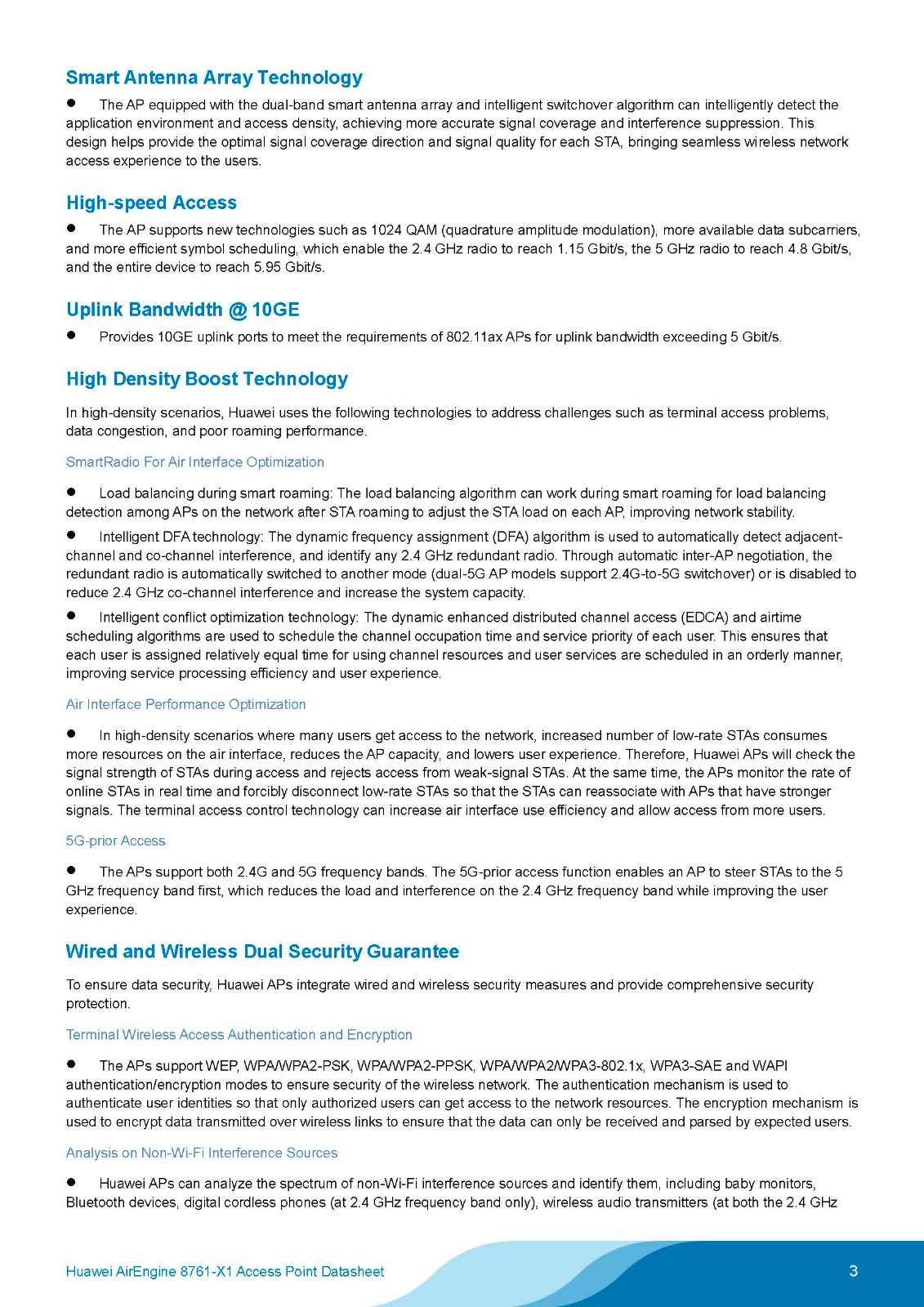 AirEngine 8761-X1 is a next-generation Wi-Fi 6 (802.11ax) access point (AP). It has built-in Smart Antennas and supports a maximum of 12 spatial streams, delivering a rate of 5.95 Gbit/s. With its 10GE port, the AP is free of uplink bandwidth bottlenecks. Such strengths make the AP a good fit for high-bandwidth services such as HD video streaming, multimedia, and desktop cloud, providing high-quality wireless services for enterprises.