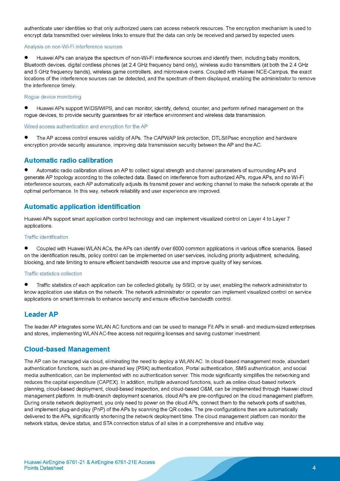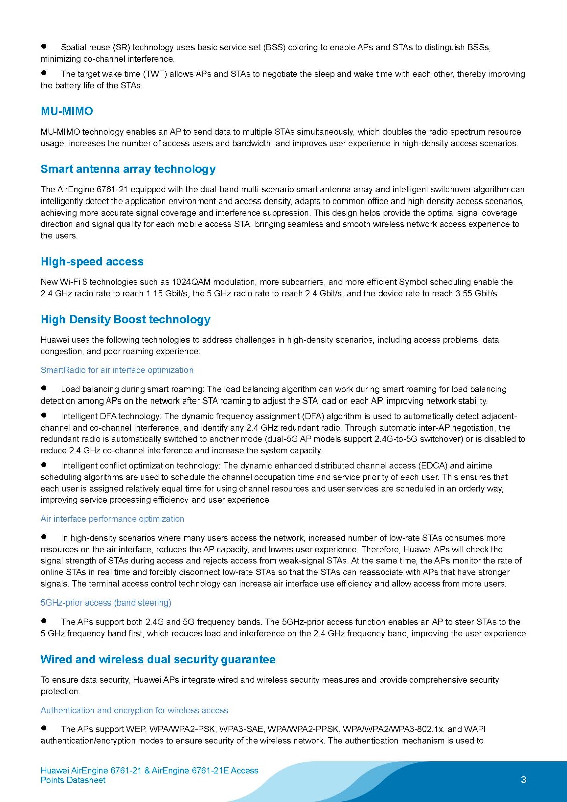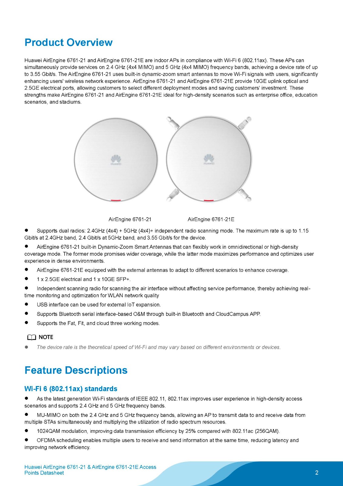 AirEngine 6761-21 and AirEngine 6761-21E are indoor Wi-Fi 6 (802.11ax) Access Points (APs) designed for high-density scenarios such as small and midsize enterprise offices, education institutions, and stadiums.
