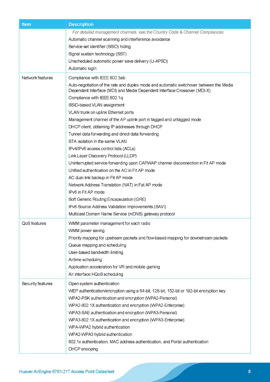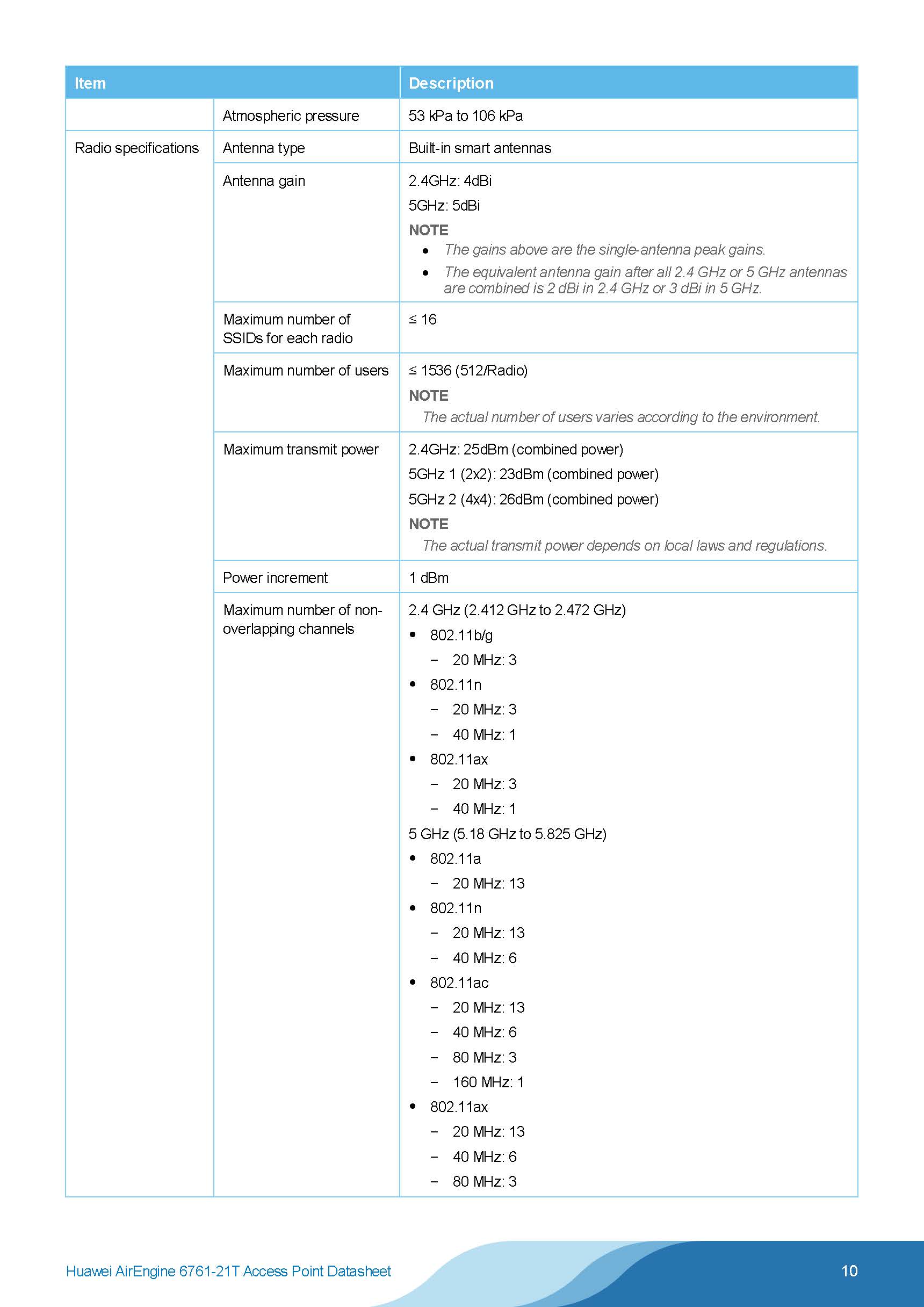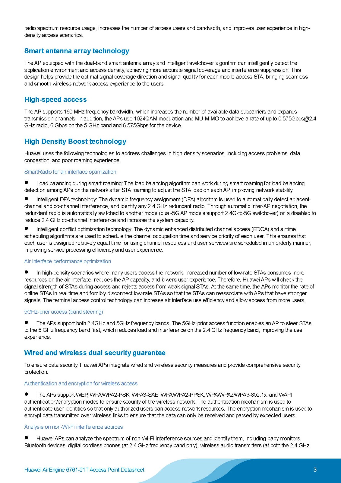 A next generation indoor Wi-Fi 6 (802.11ax) Access Point (AP), AirEngine 6761-21T features triple-band radios — 1 x 2.4 GHz and 2 x 5 GHz — plus built-in Smart Antennas that enhance coverage and signal quality, offering a rate of up to 6.575 Gbit/s.