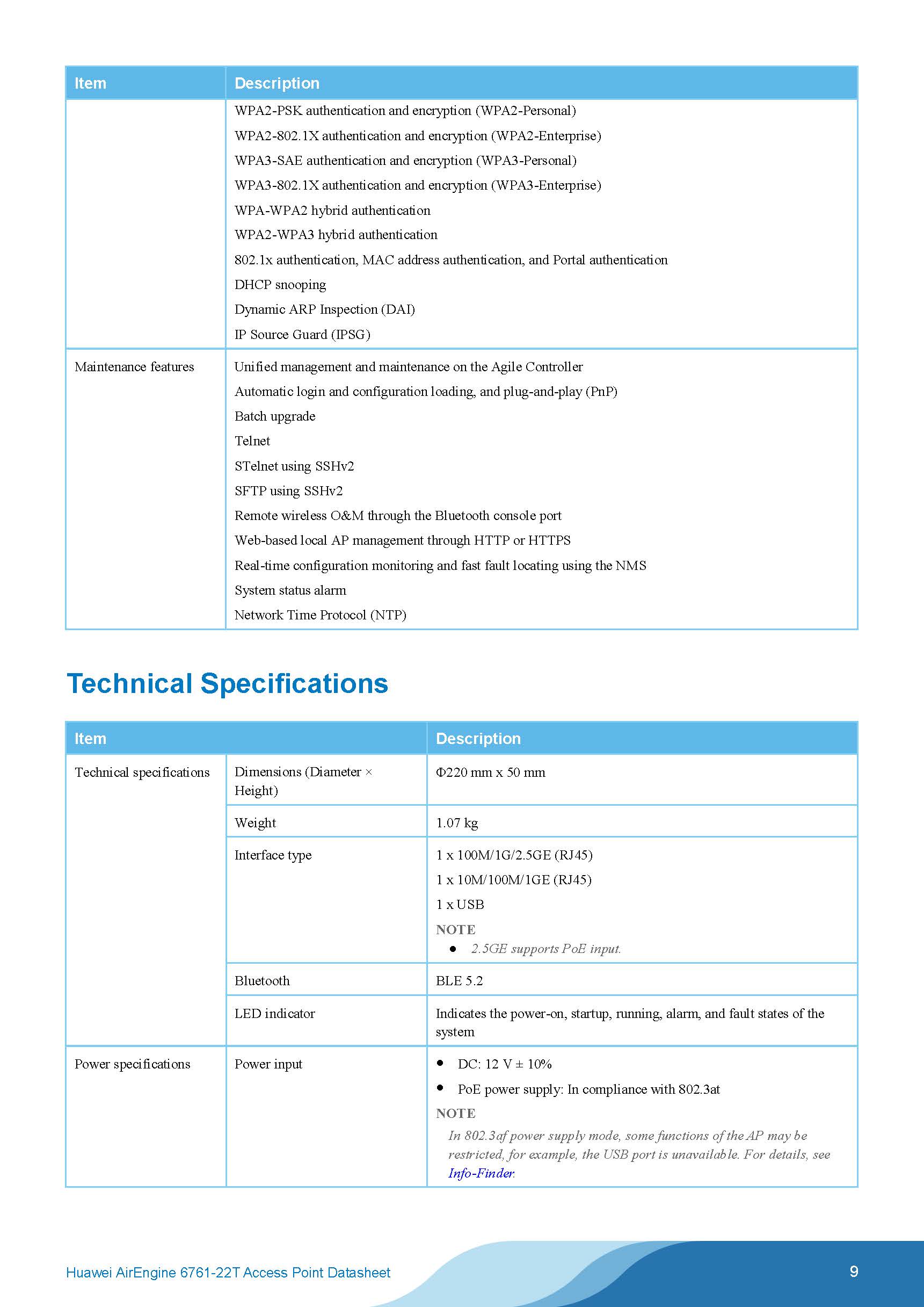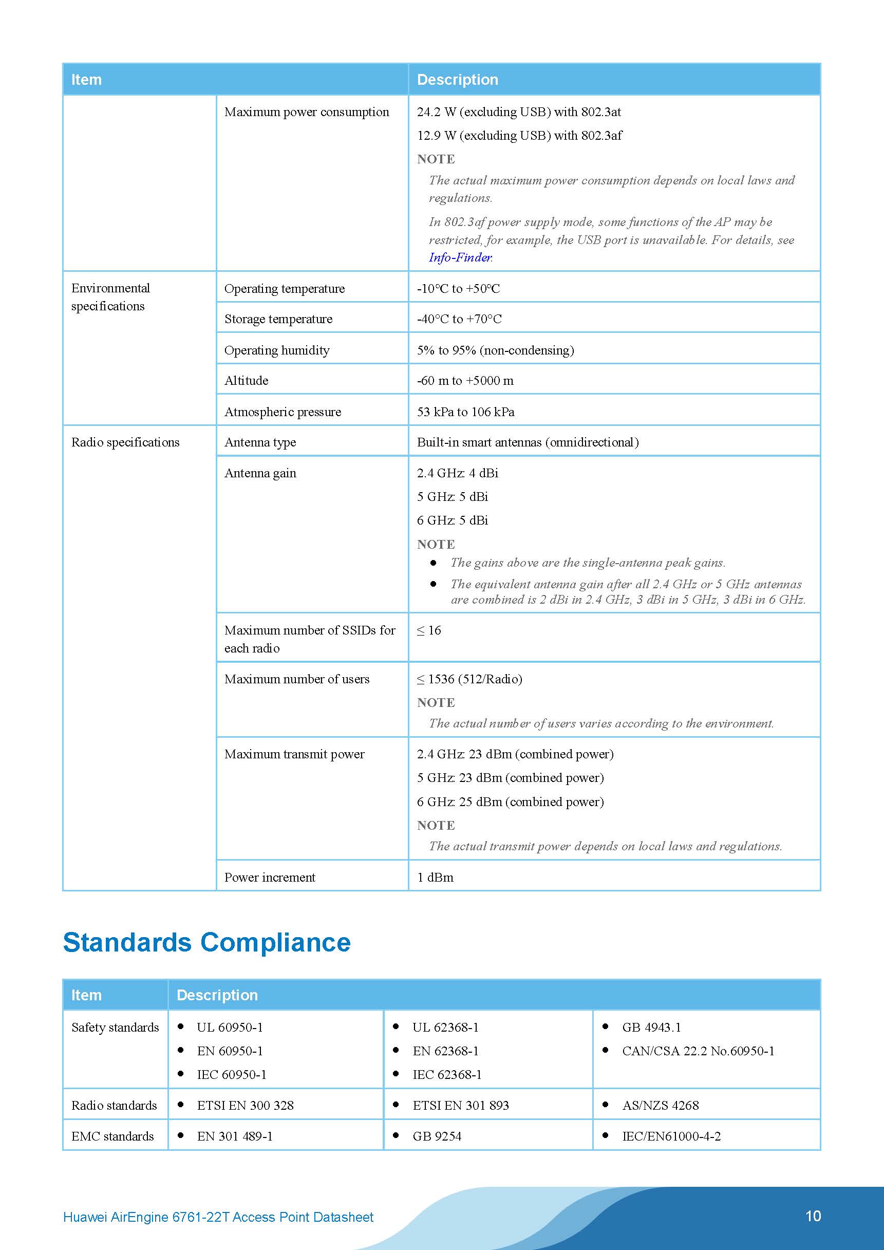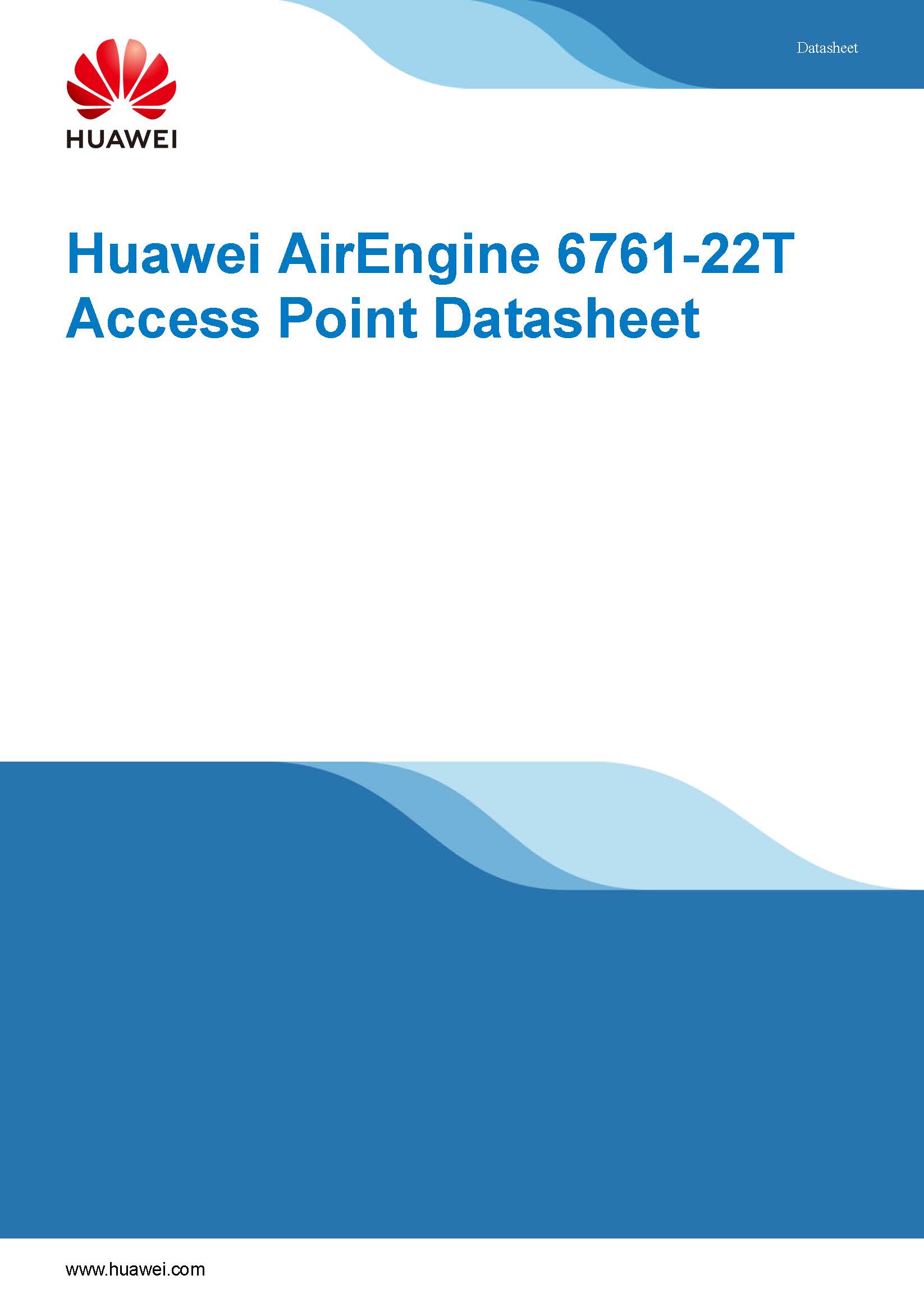 Compliant with the Wi-Fi 6 (802.11ax) standard, Huawei AirEngine 6761-22T is an indoor Wi-Fi 6 Extended (Wi-Fi 6E) Access Point (AP) with built-in Smart Antennas and a triple-radio design. Boasting eight spatial streams and a maximum device rate of 6.575 Gbit/s — 0.575 Gbit/s at 2.4 GHz, 1.2 Gbit/s at 5 GHz, and 4.8 Gbit/s at 6 GHz — AirEngine 6761-22T is designed for enterprise offices, stadiums, education institutions, and manufacturing scenarios.