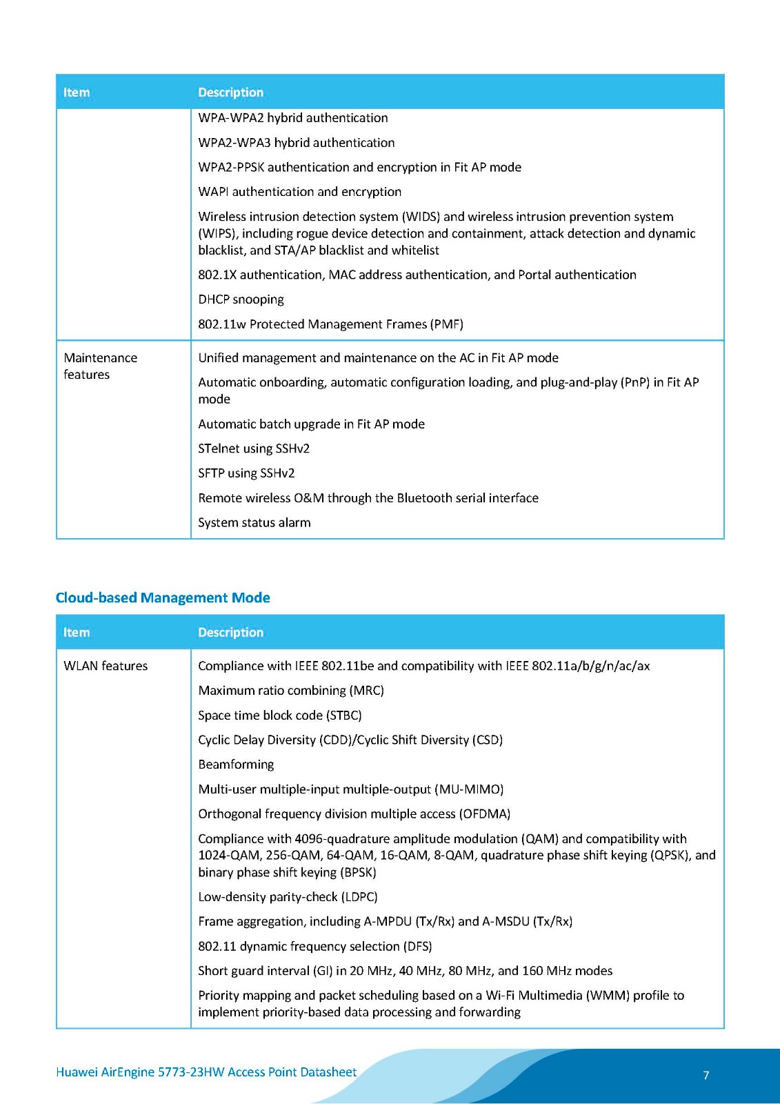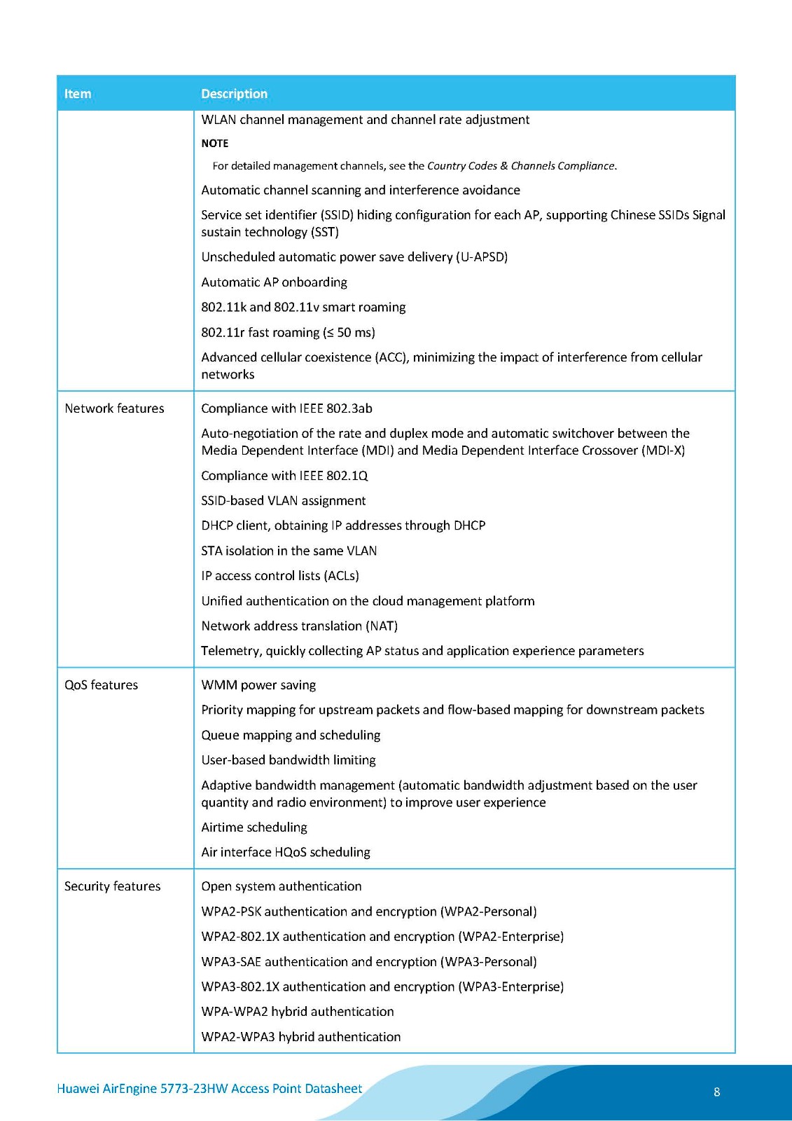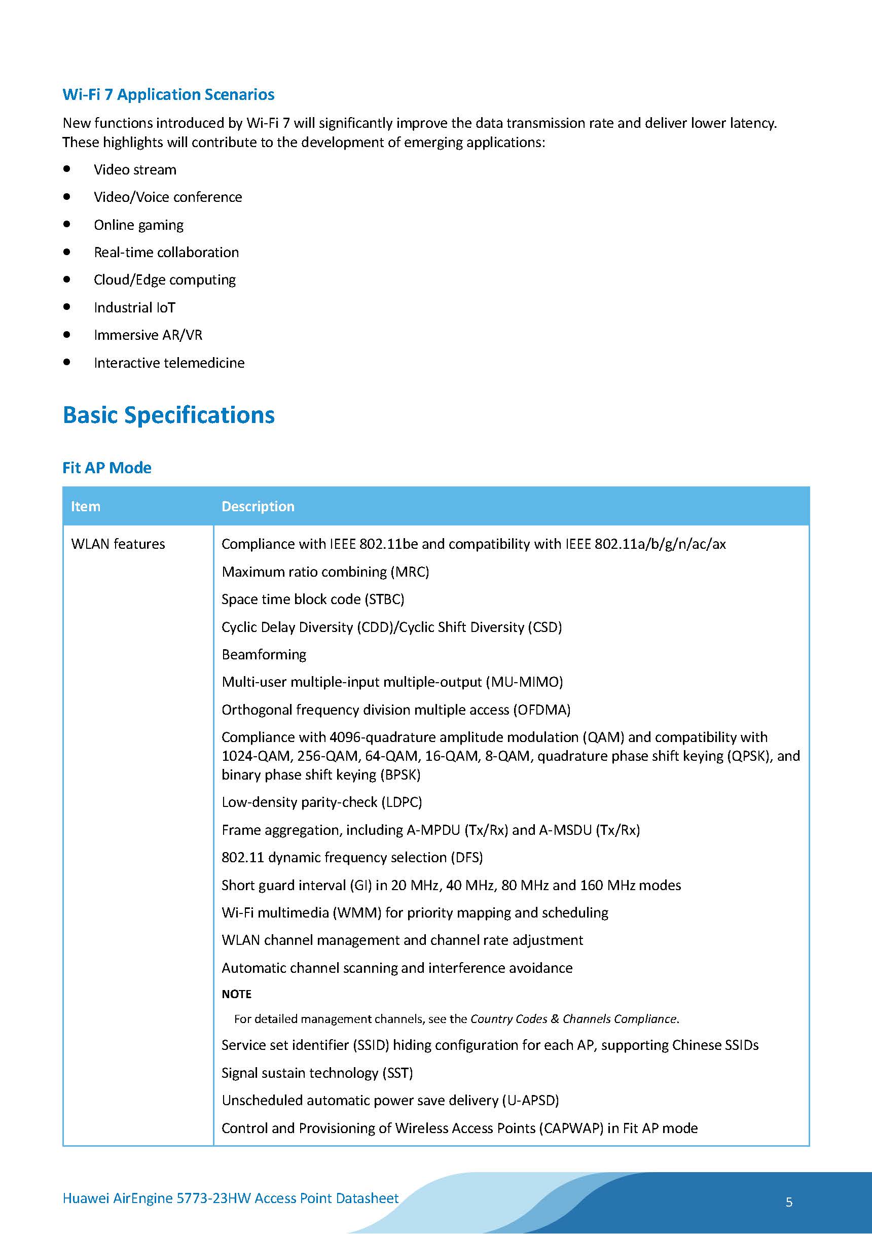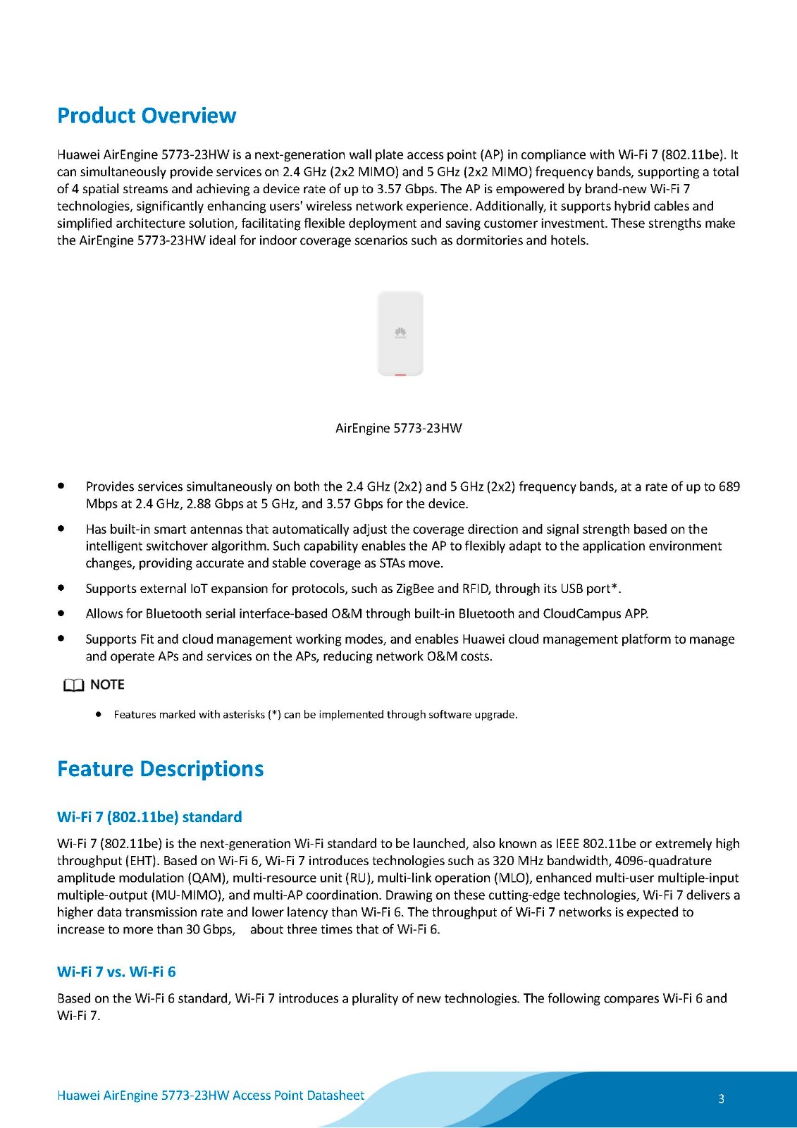 Huawei AirEngine 5773-23HW is a next-generation wall plate Access Point (AP) in compliance with Wi-Fi 7 (802.11be). It can simultaneously provide services on 2.4 GHz (2x2 MIMO) and 5 GHz (2x2 MIMO) frequency bands, supporting a total of 4 spatial streams and achieving a device rate of up to 3.57 Gbps. The AP is empowered by brand-new Wi-Fi 7 technologies, significantly enhancing users' wireless network experience. Additionally, it supports hybrid cables and simplified architecture solution, facilitating flexible deployment and saving customer investment. These strengths make the AirEngine 5773-23HW ideal for indoor coverage scenarios such as SMB workplaces, higher education institutions, and hospitals.