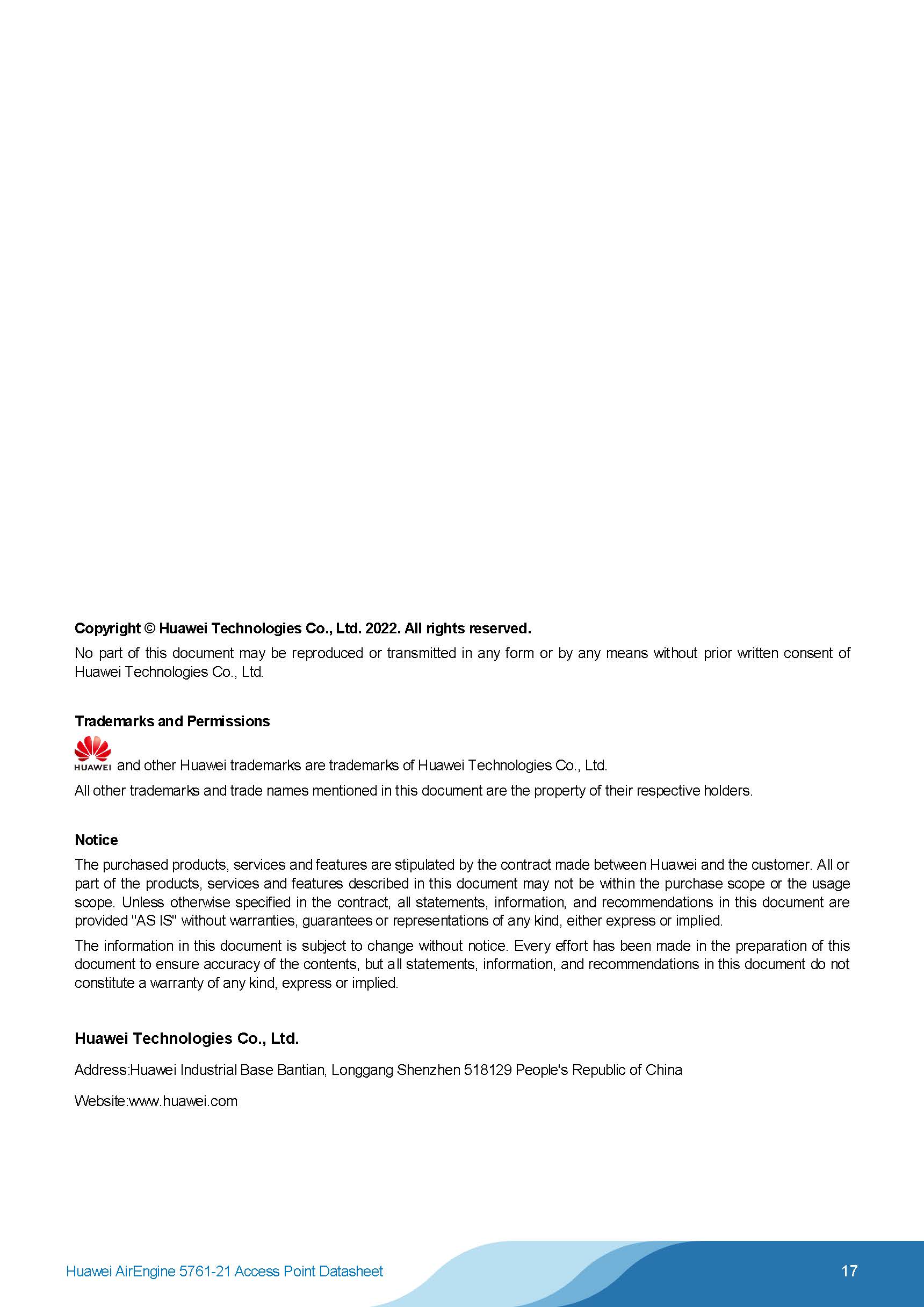 A next generation indoor Wi-Fi 6 (802.11ax) Access Point (AP), AirEngine 5761-21 supports six spatial streams and features built-in Smart Antennas, where Wi-Fi signals follow users to deliver always-on coverage, with a maximum rate of 5.375 Gbit/s.