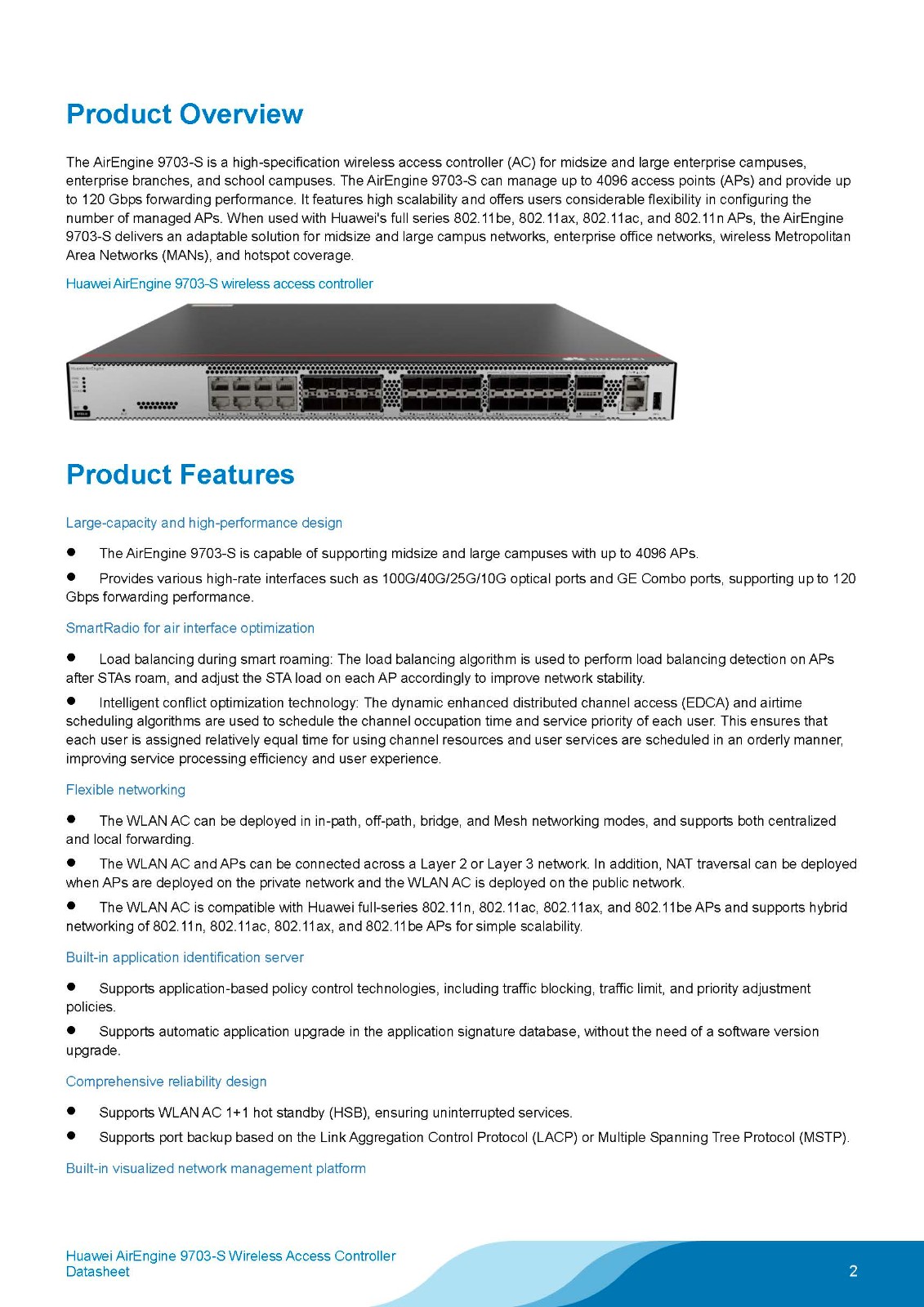 When used with Huawei APs in compliance with 802.11n/ac/ax/be, the AirEngine 9703-S can be used to construct midsize and large campus networks, enterprise office networks, wireless Metropolitan Area Networks (MANs), and hotspot coverage networks.