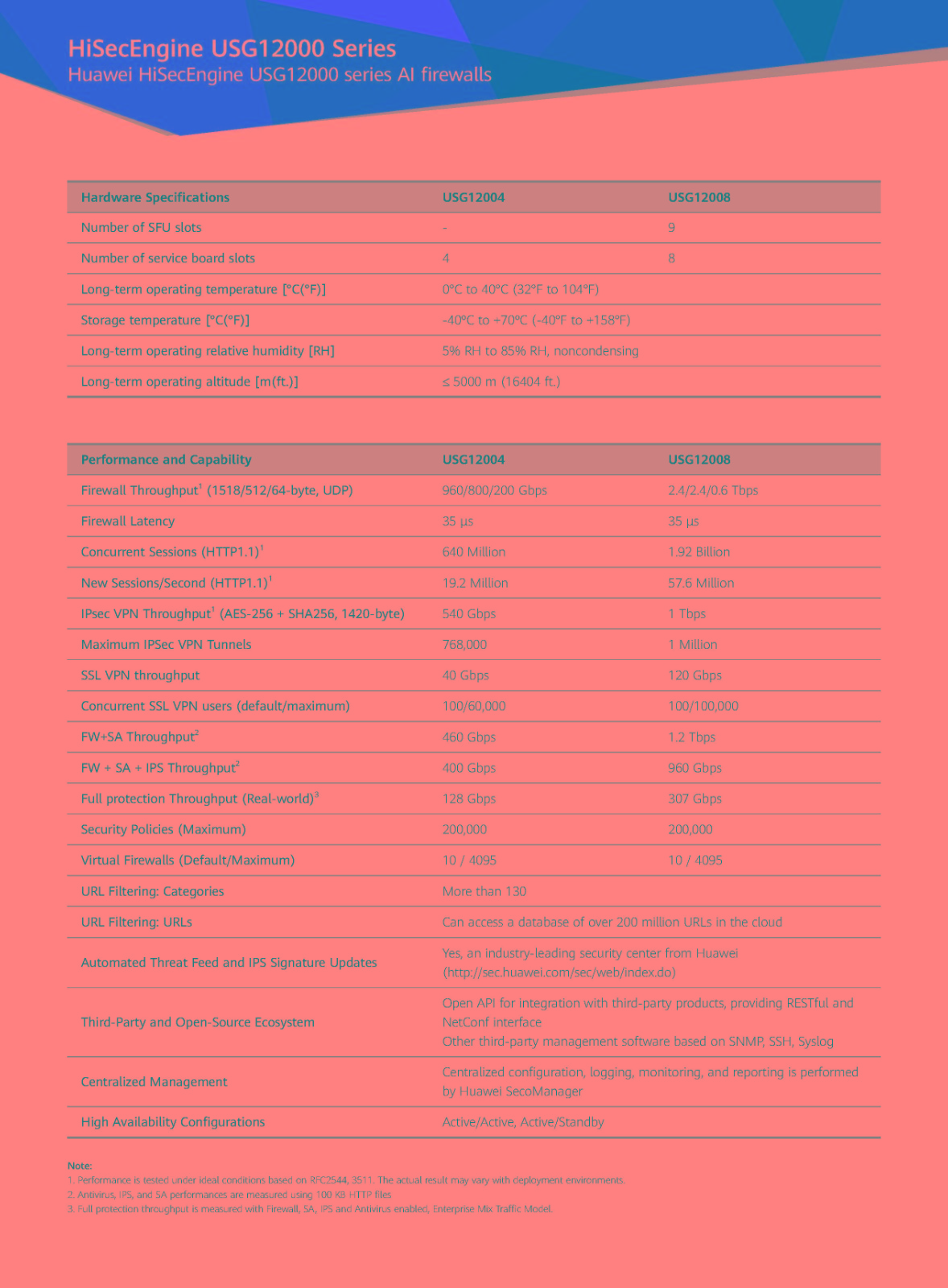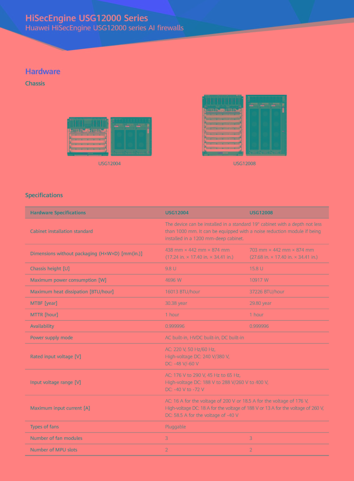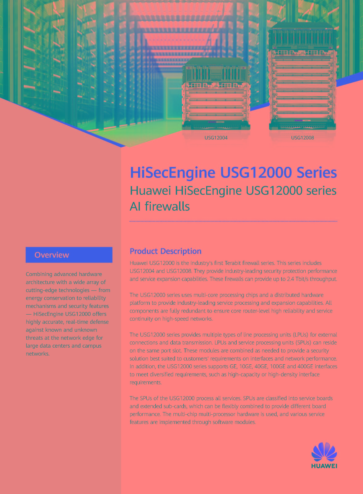 The HiSecEngine USG12000 series is the industry's first terabit-level Artificial Intelligence (AI) firewall launched by Huawei for mitigating known and unknown threats at the network edge in real-time. It is typically deployed at the egress of cloud computing data centers, large enterprises, and campus networks to provide industry-leading protection capabilities.