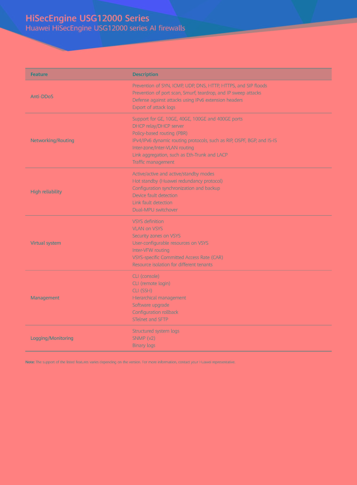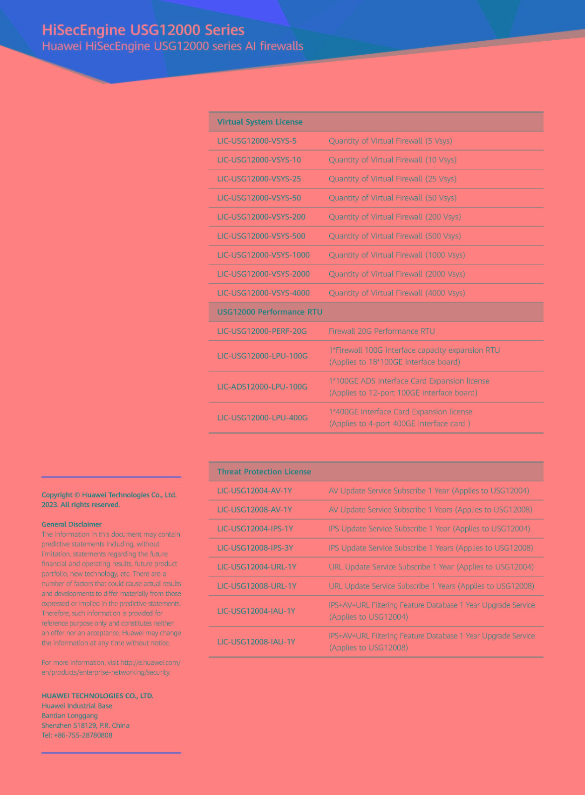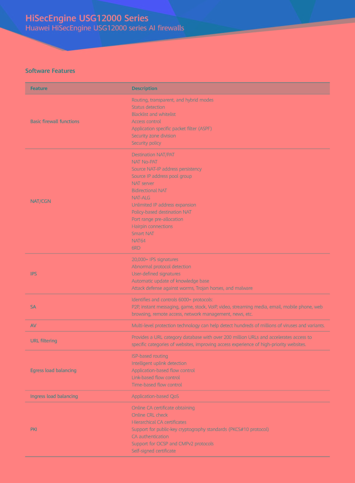 The HiSecEngine USG12000 series is the industry's first terabit-level Artificial Intelligence (AI) firewall launched by Huawei for mitigating known and unknown threats at the network edge in real-time. It is typically deployed at the egress of cloud computing data centers, large enterprises, and campus networks to provide industry-leading protection capabilities.