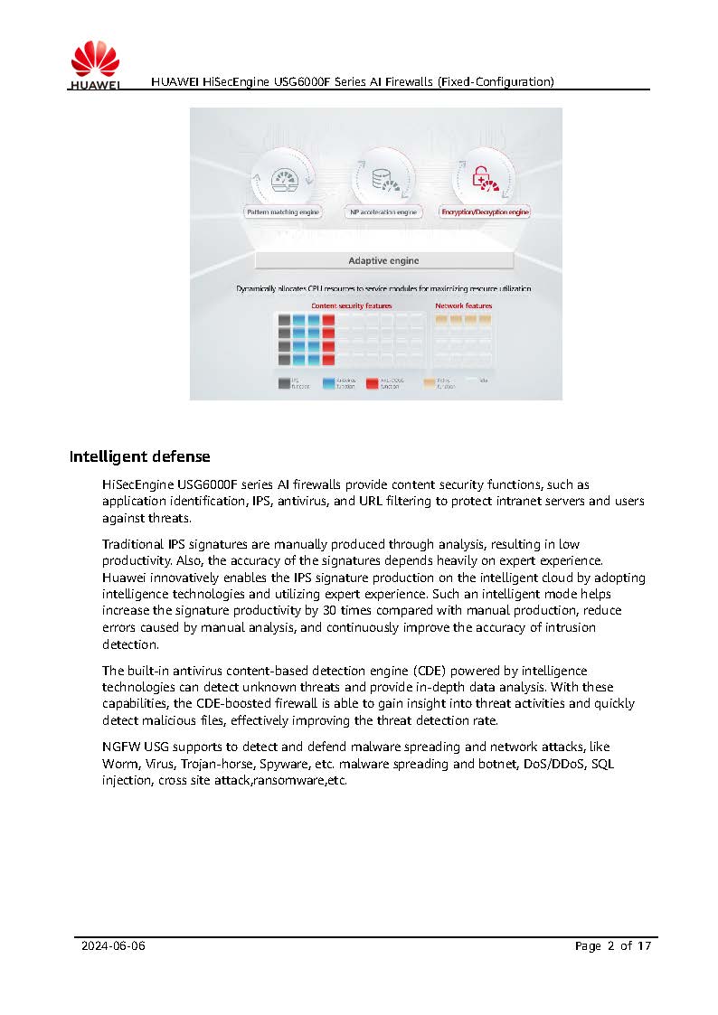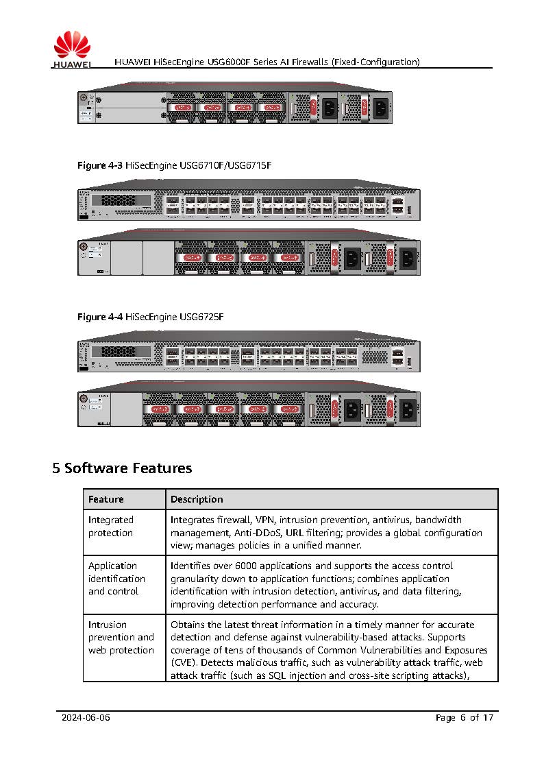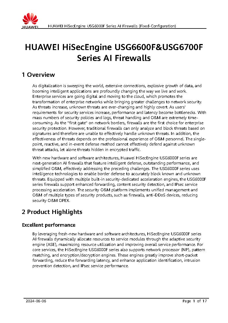 Featuring new hardware and software architectures, Huawei HiSecEngine USG6700F series is a range of next generation Artificial Intelligence (AI) firewalls that use intelligent technologies to enable border defense, accurately blocking known and even unknown threats.