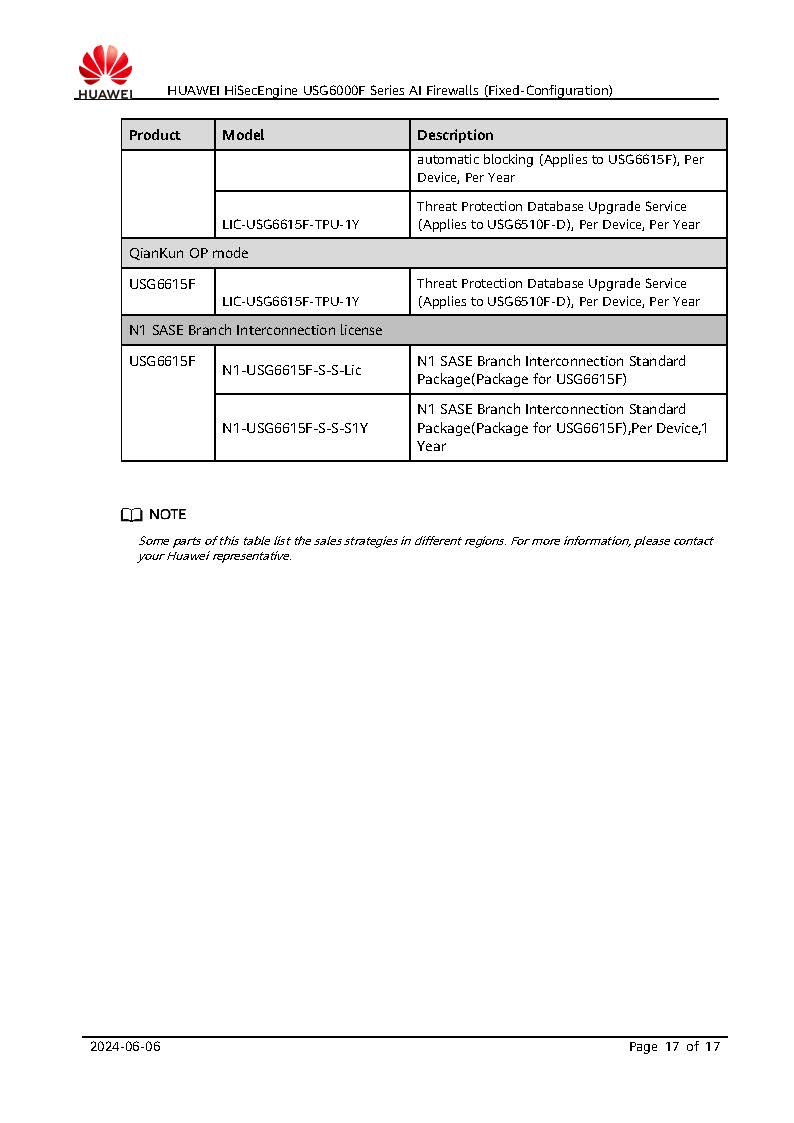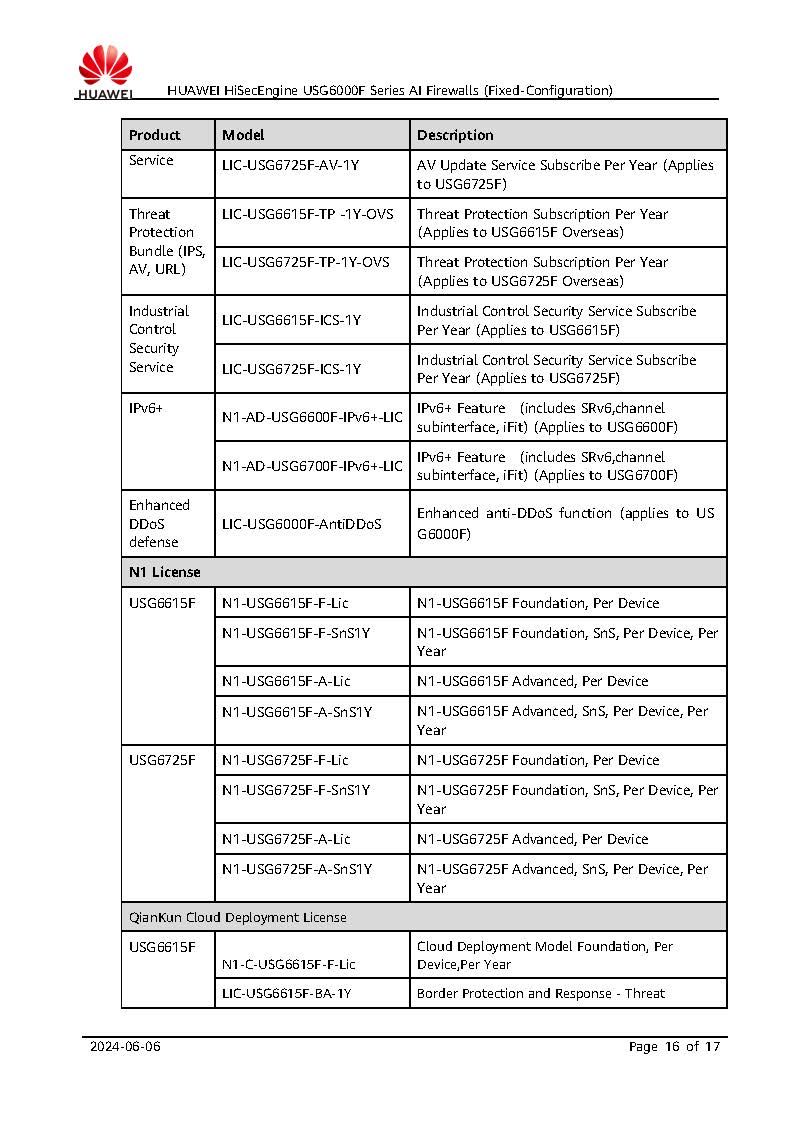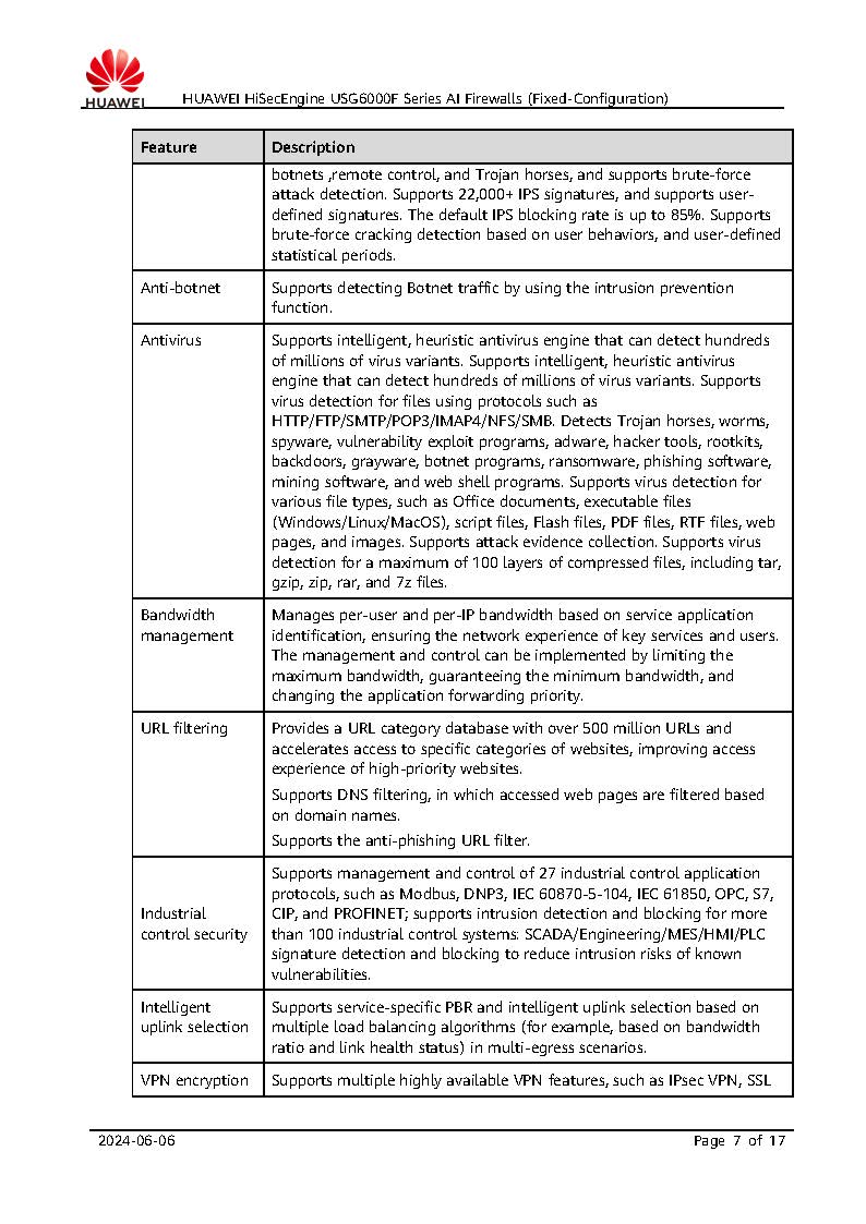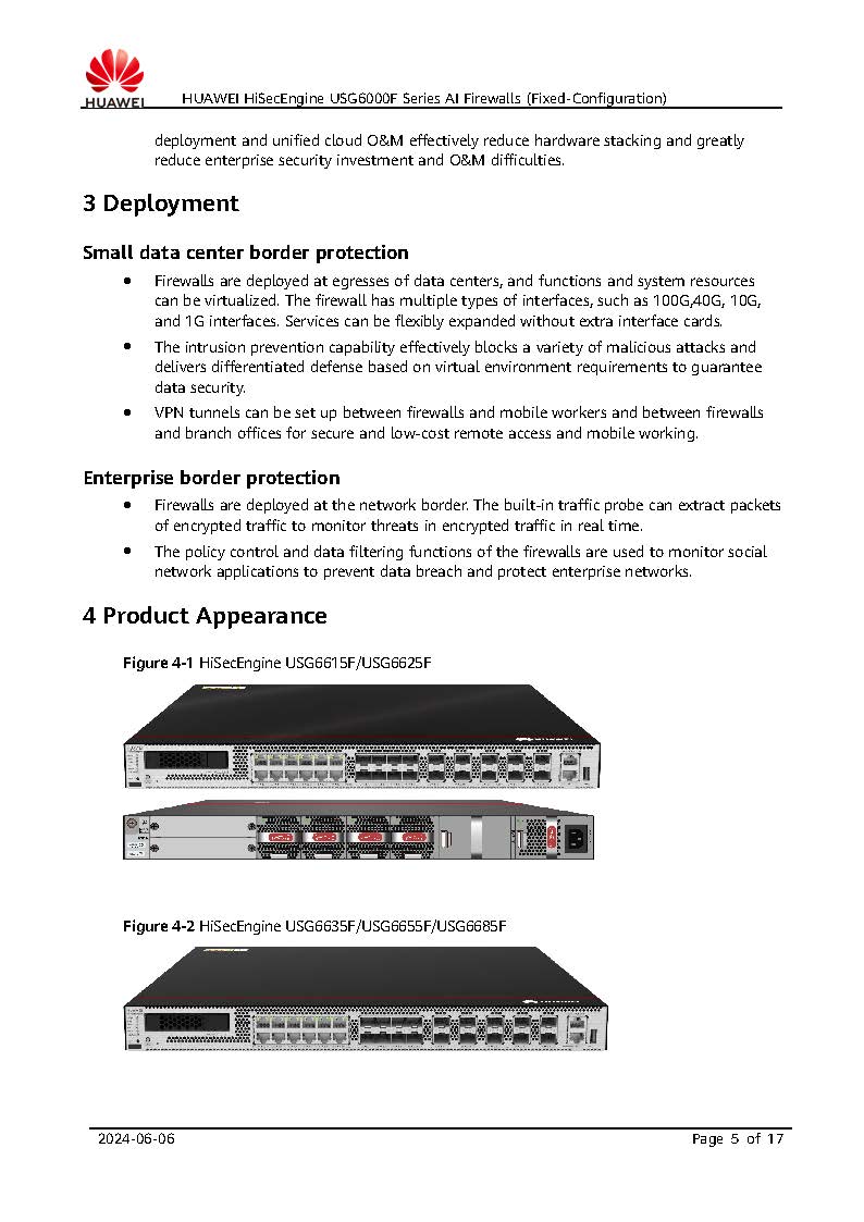 Featuring new hardware and software architectures, Huawei HiSecEngine USG6700F series is a range of next generation Artificial Intelligence (AI) firewalls that use intelligent technologies to enable border defense, accurately blocking known and even unknown threats.