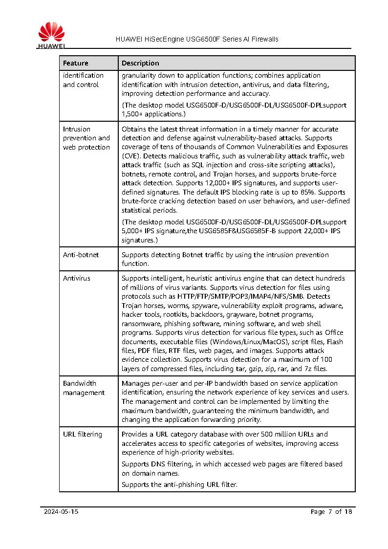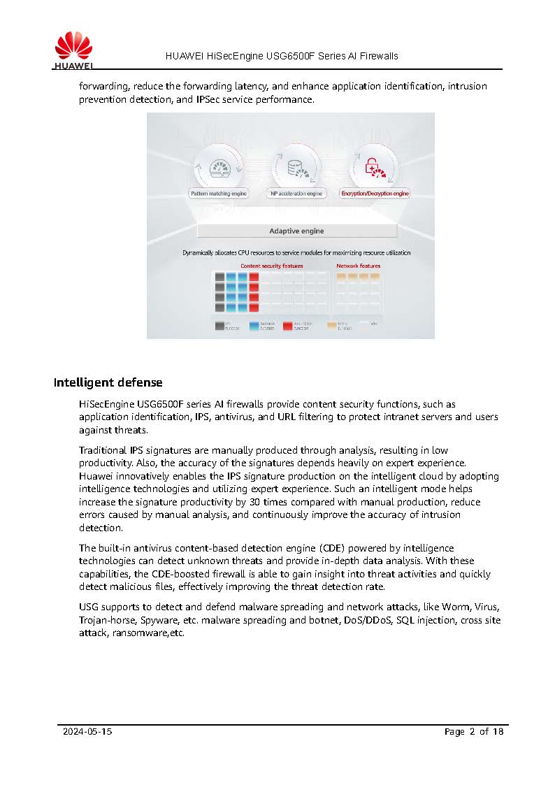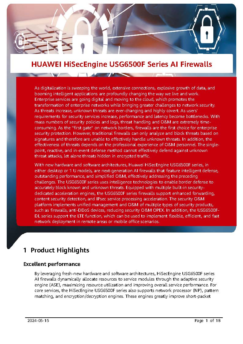 HiSecEngine USG6500F-D series AI firewalls are new-generation desktop firewalls launched by Huawei for small enterprises, industry branches, and chain business organizations. With unique content detection engine (CDE), the USG6500F-D series can detect viruses with over 100 layers of compression and multi-layer hidden viruses. Through integrated deployment of the network and security controllers, network and security policies can be configured and delivered in a unified manner, reducing OPEX by 80%.