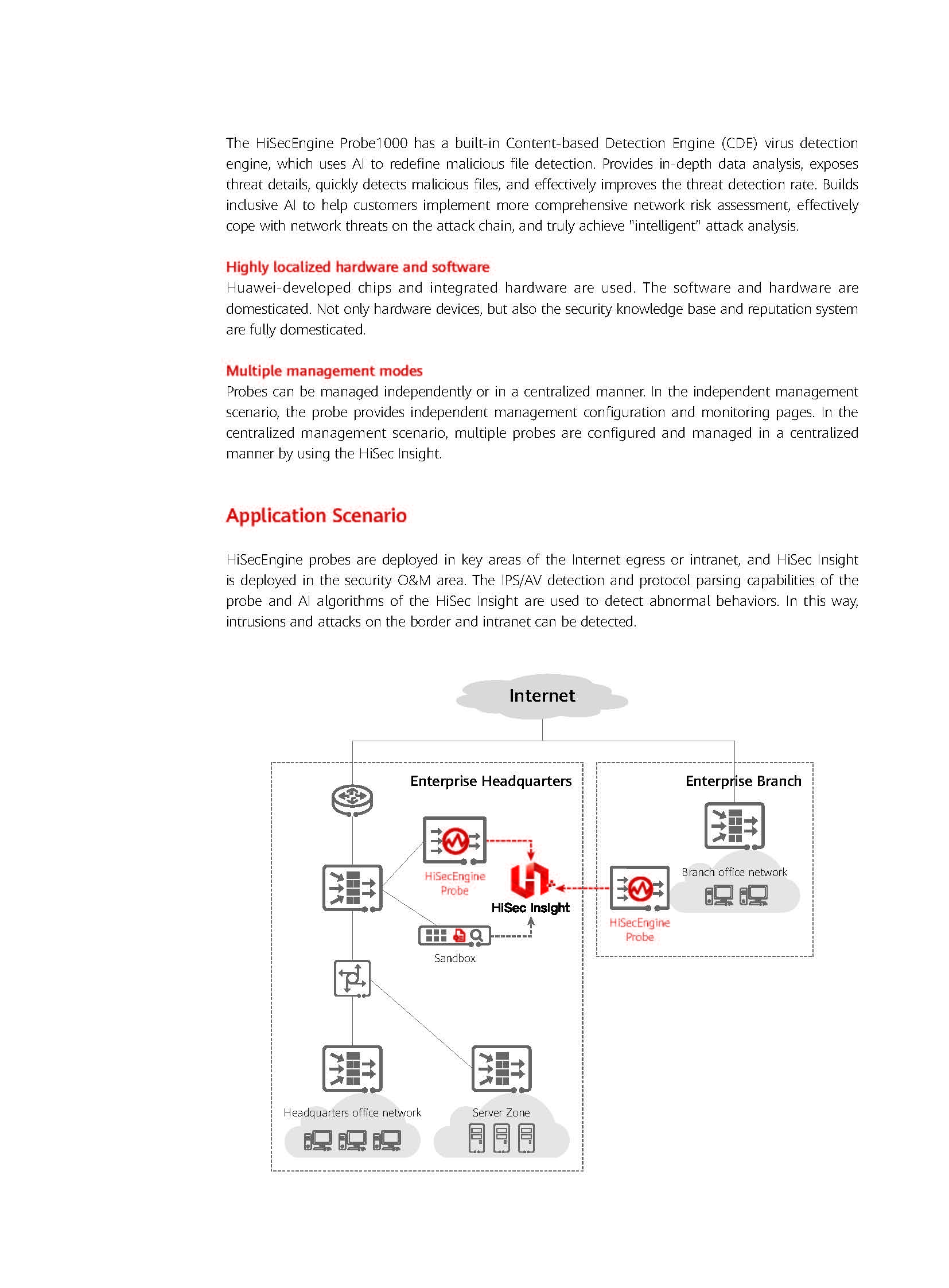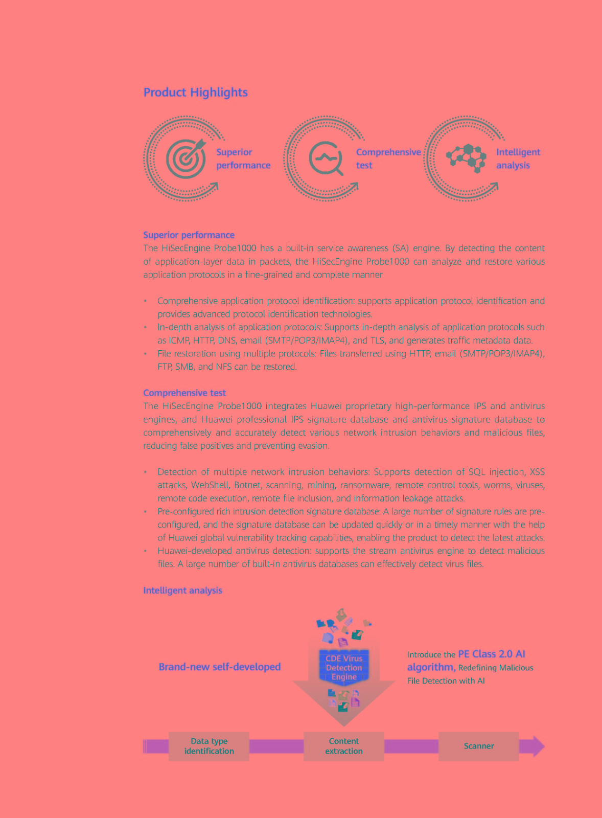 Huawei HiSecEngine Probe1000 is the traffic probe of Huawei HiSec Insight security situational awareness platform. It is used by small, medium, and large enterprises, such as governments, finance, education, healthcare, and carriers. The HiSecEngine Probe1000 uses Huawei-developed dedicated security chips and NGE engines, and provides powerful IPS, antivirus, and malicious file detection capabilities. Parses traffic of protocols such as HTTP, DNS, ICMP, email, and TLS and sends metadata data to the third-party big data platform. Mainstream files can be restored. Supports PCAP packet capture to obtain event processing evidence collection information. The HiSecEngine Probe1000 has an independent web management page, which can be centrally managed by the Huawei HiSec Insight system and interconnected with a third-party big data platform.