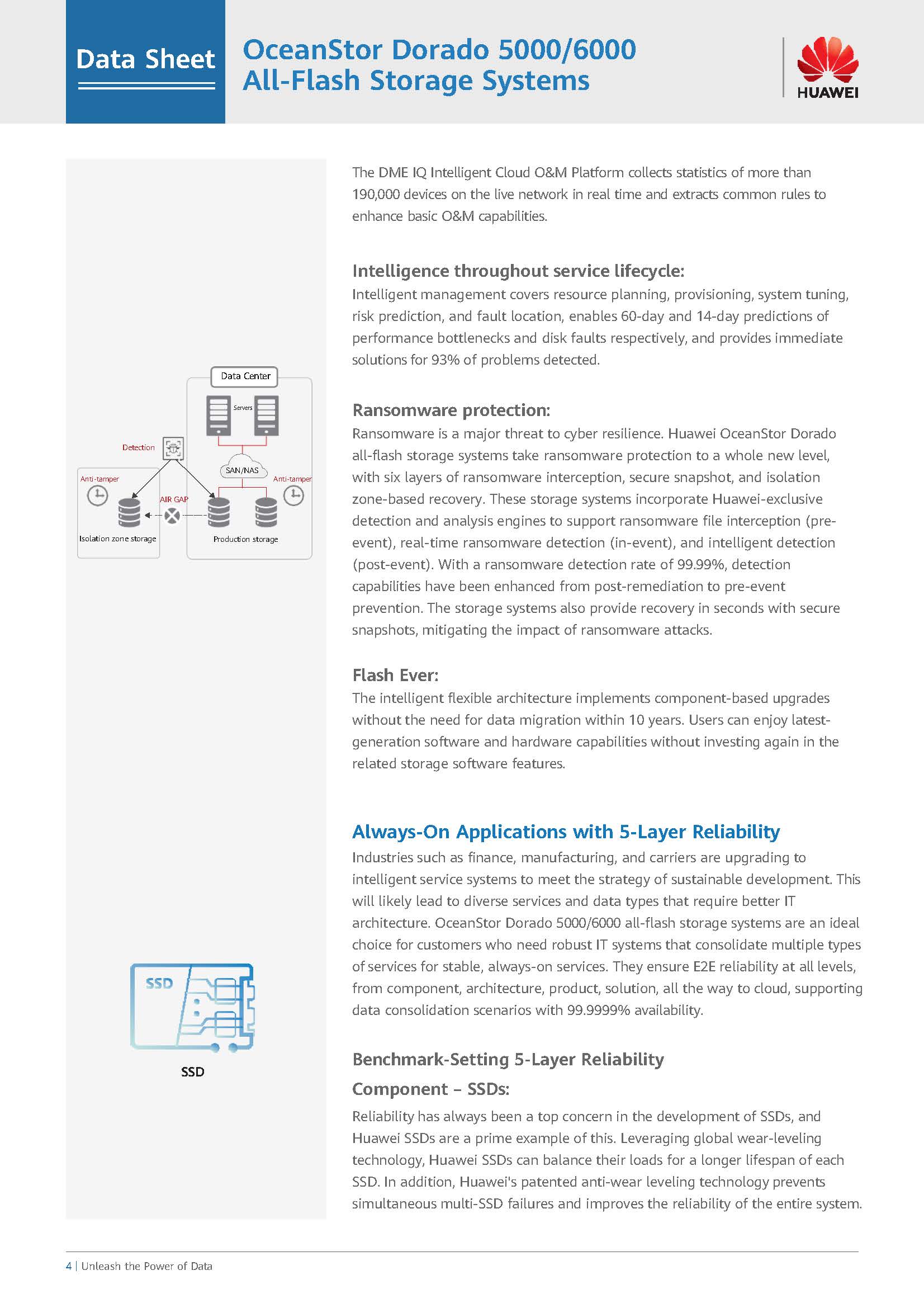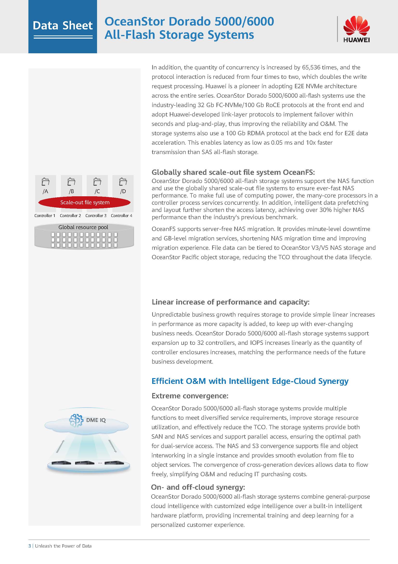 Huawei OceanStor Dorado 5000 and 6000 are the next generation of mid-range all-flash storage systems. They are designed to meet the major concerns of high availability, utilization, and usability for medium and large enterprises, offering huge storage capacity and quick data access.