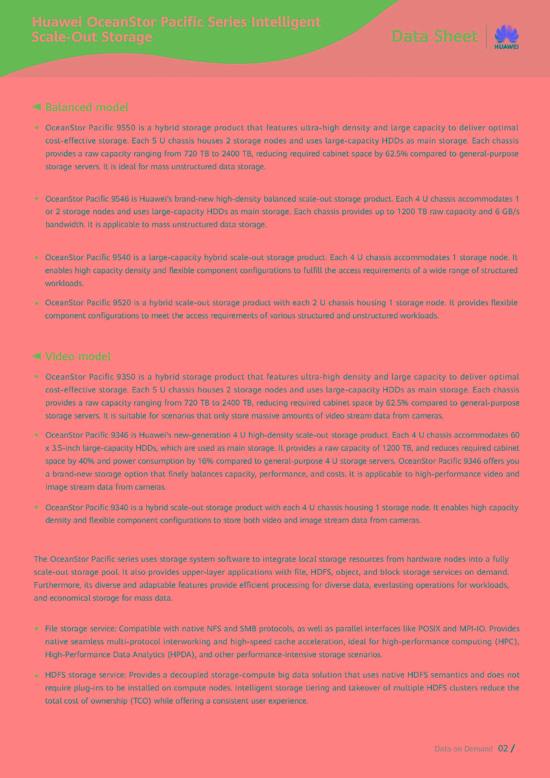 OceanStor Pacific 9540 also offers a maximum of 22 + 2 Erasure Code (EC) redundancy ratio, achieving a disk space utilization rate of 91.6%. The system is cost effective and can work with OceanStor Pacific 9920 to build a tiered storage solution. Indeed, OceanStor Pacific 9540 provides flexible data access services for diverse scenarios, from virtualization and cloud resource pools to High Performance Computing (HPC), Artificial Intelligence (AI) applications, and big data analytics, as well as long-term backup and archiving of mass data.