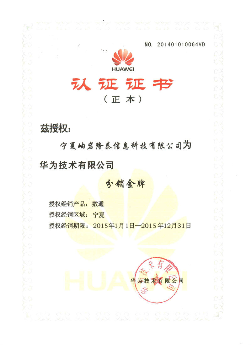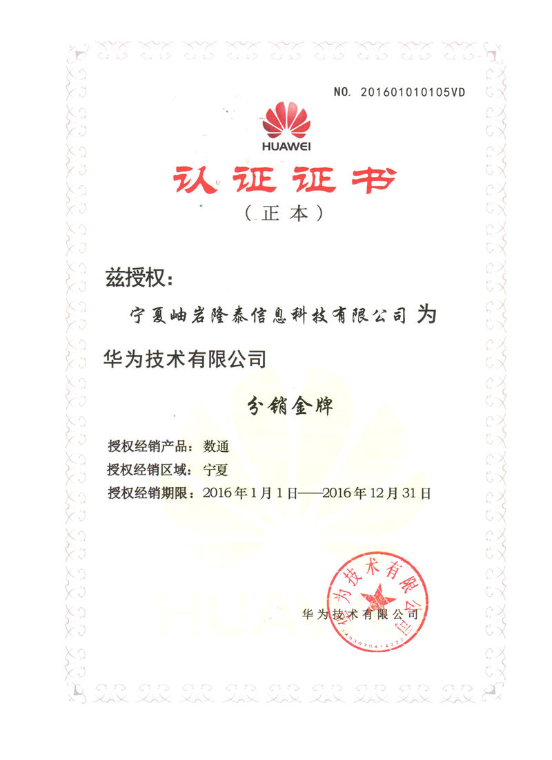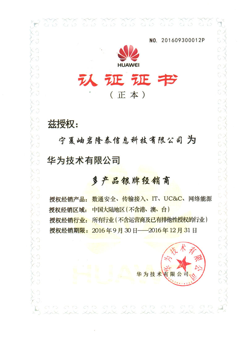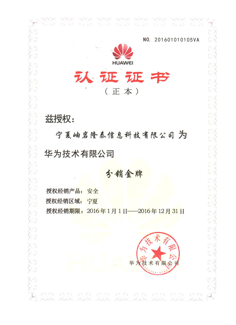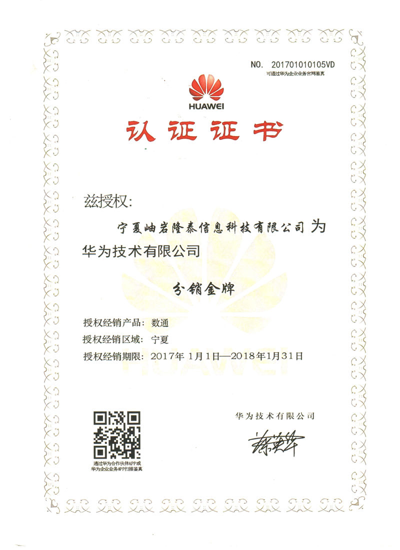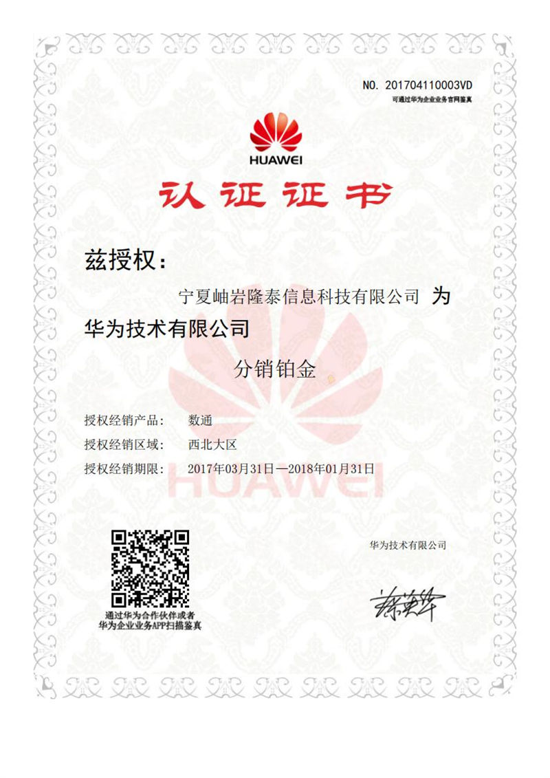 Ningxia Xiuyan Longtai Information Technology Co., Ltd. 2017 Huawei Platinum Agent Certificate