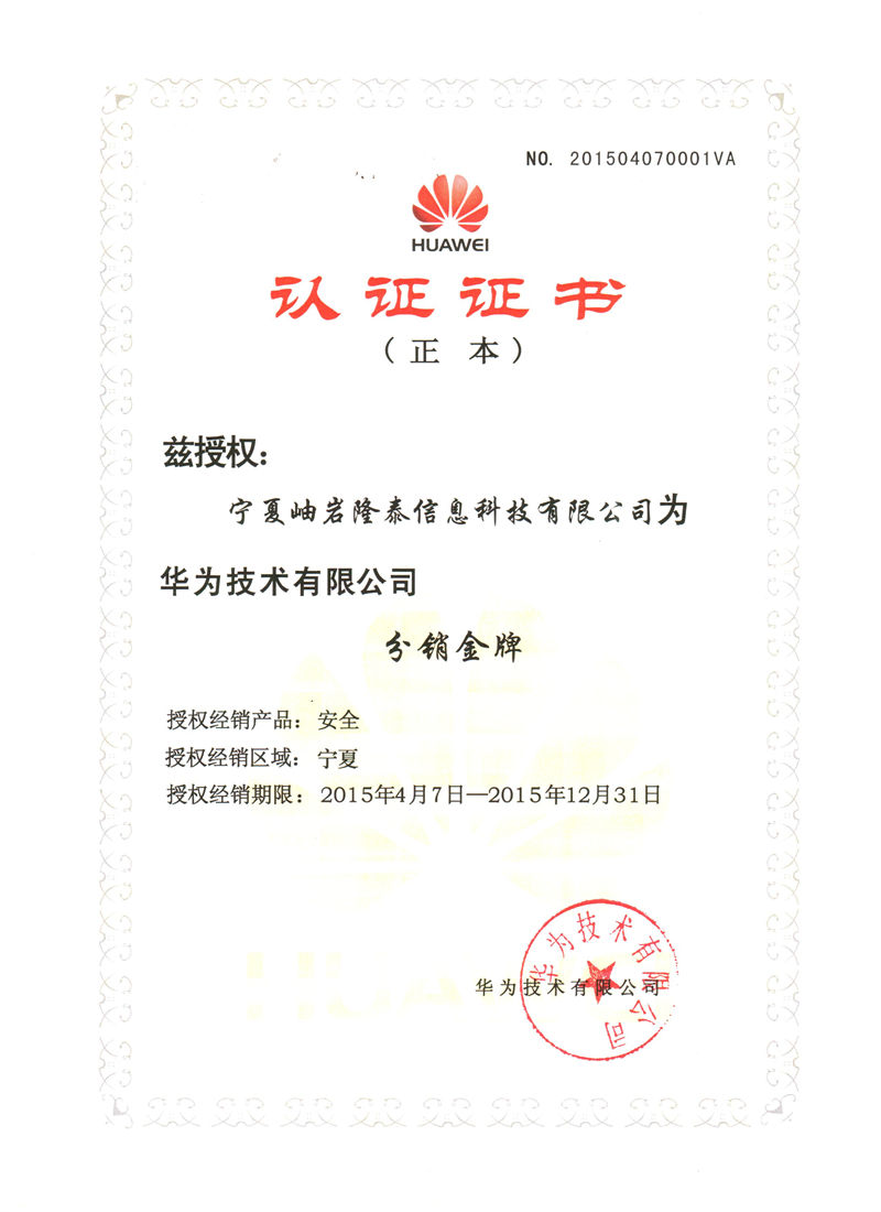 Ningxia Xiuyan Longtai Information Technology Co., Ltd. 2015 Ningxia Certified Gold Distributor for Security Distribution