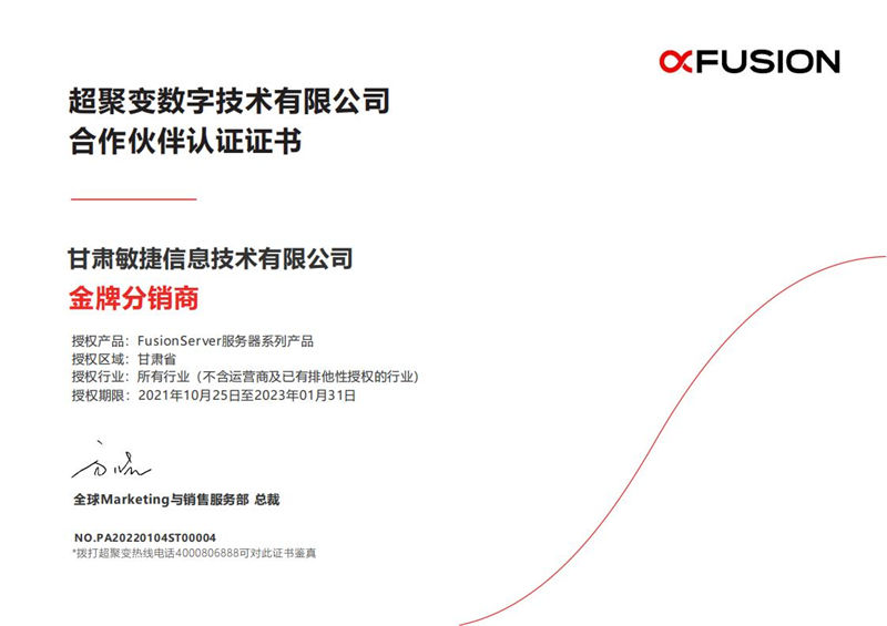 Gansu Agile Information Technology Co., Ltd. 2021 xFusion Gold Distributor Authorization Certificate